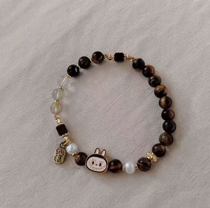 天然石タイガーアイ×ラブブ♪ 天然タイガーアイ Labubu ブレスレット キャラメルカラー シングル層 ダブルスタック ハンドアクセサリー 高級感 ペア・親友お揃い