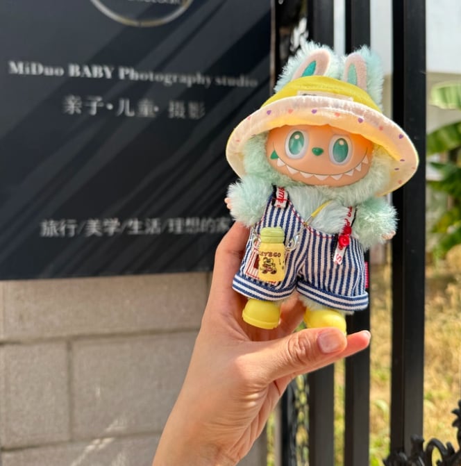 【帽子+オーバーオール+水筒+シューズ】目を引く鮮明な黄色♪ ラブブ 着せ替え用 Labubuコーラテーマ オーバーオールセット 学園風 ストライプ水筒型帽子付き