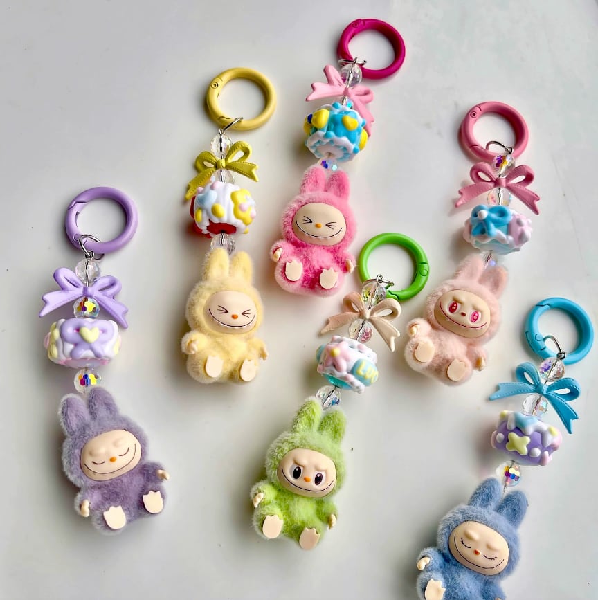 新作 リボンミルクキャンディ風 ♪ ファー付き ラブブ キーホルダー ストラップ ちっちゃな粒タイプ 超可愛い