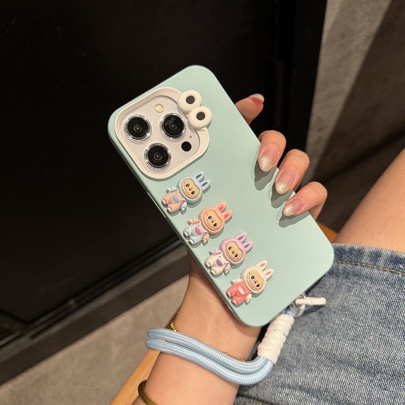 ラブブ風スマホケース 立体チャームストラップ付き 耐衝撃 iPhone ケース 水色 夏のおしゃれ 上品 かわいい デザイン