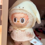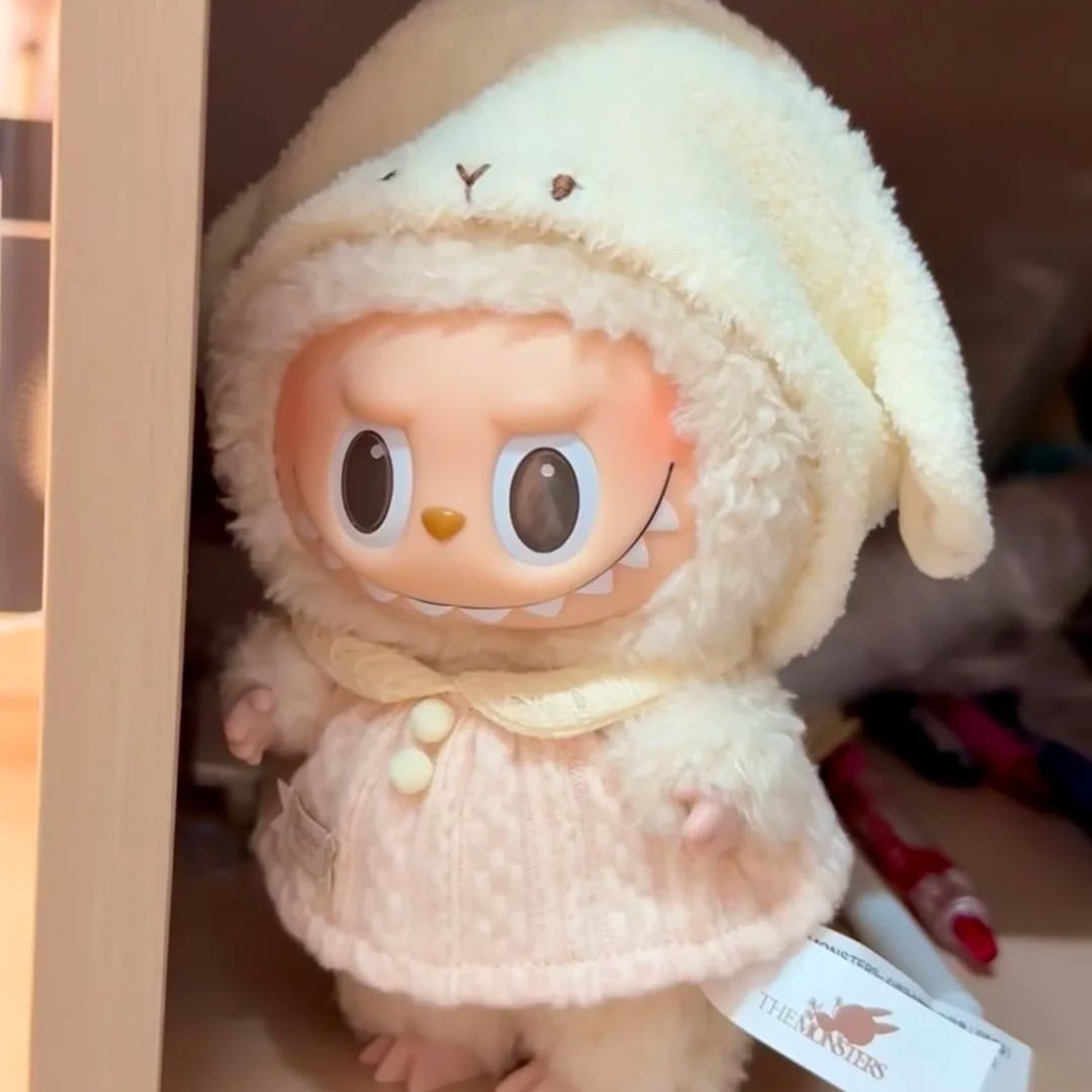 【帽子+ワンピース】labubu ラブブ用 赤ちゃんみたいに可愛いドール衣装! もこもこラムフード&桜色ニットワンピース 17cm用