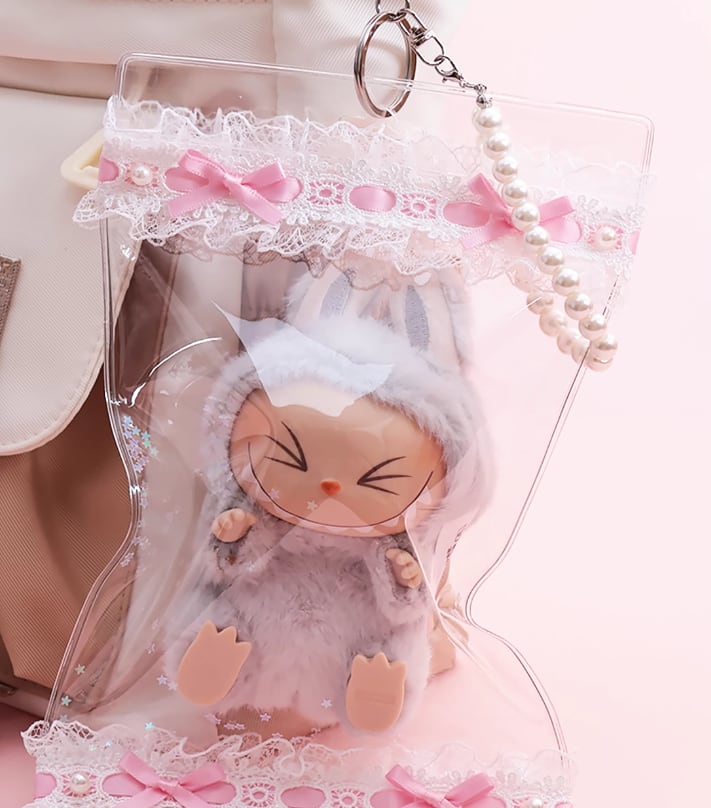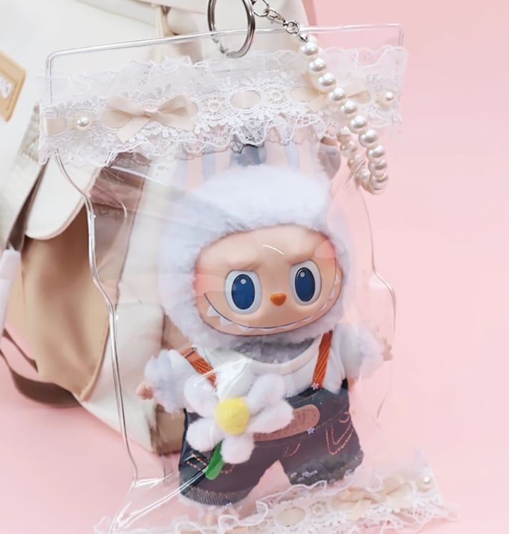 Labubu 透明ケース レース飾り♪ ラブブ お出かけ用 ほこりよけケース 全世代対応 透明 かわいい ドールキャリーケース