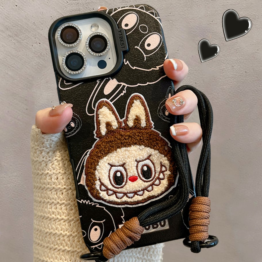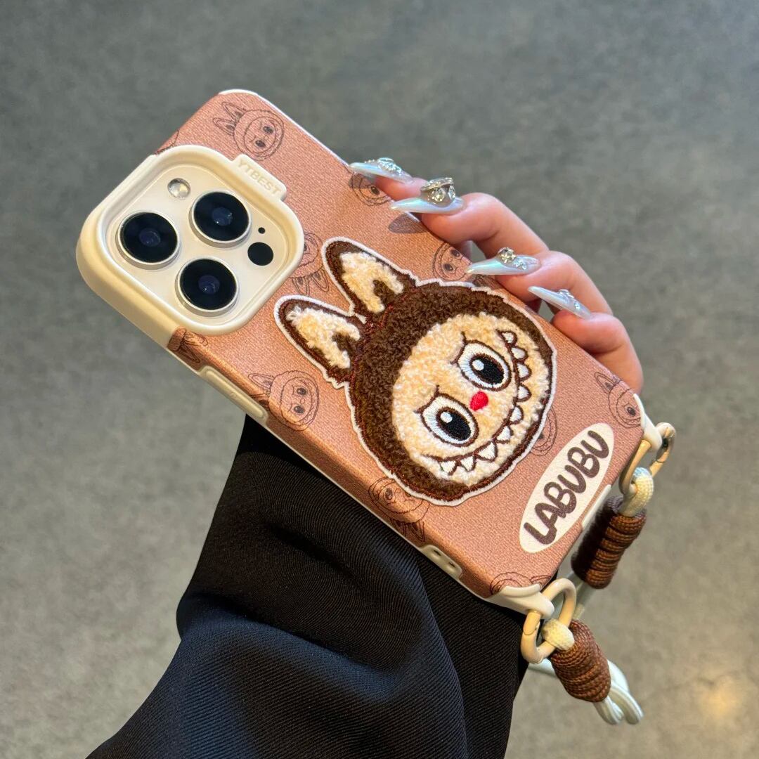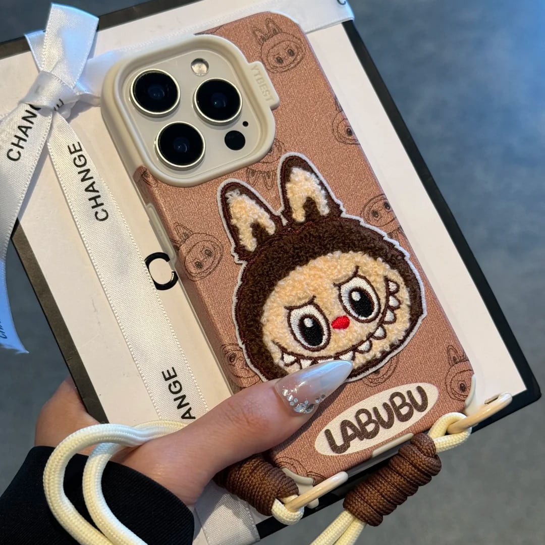 ストラップ付き モフモフ刺繍! Labubu ラブブ iPhone ケース 抜群の可愛さ 可愛い ボア刺繍 携帯カバー 携帯ケース おしゃれ