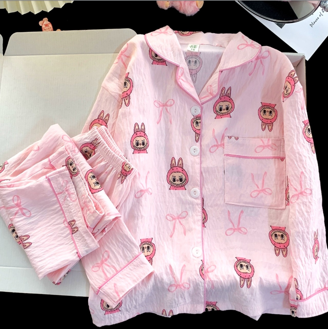 めちゃ可愛いピンク!labubu パジャマセット ラブライブ 長袖長パンツ 雲のようにふわふわコットン ピンク系 可愛い デイリー穿着 キッズ~大人用サイズ展開