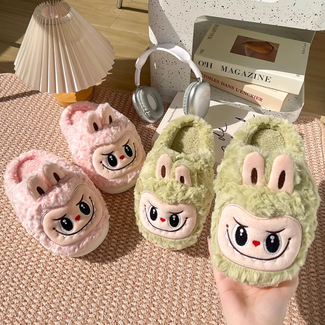モコモコで超可愛い!ふわふわの極上履き心地♡ ラブブ モフモフスリッパ つま先まで保温 秋冬のこたつルームシューズ 女性用 秋冬の室内履き labubu