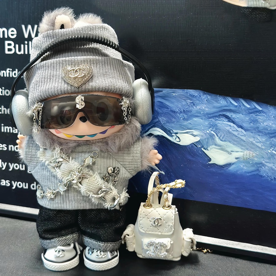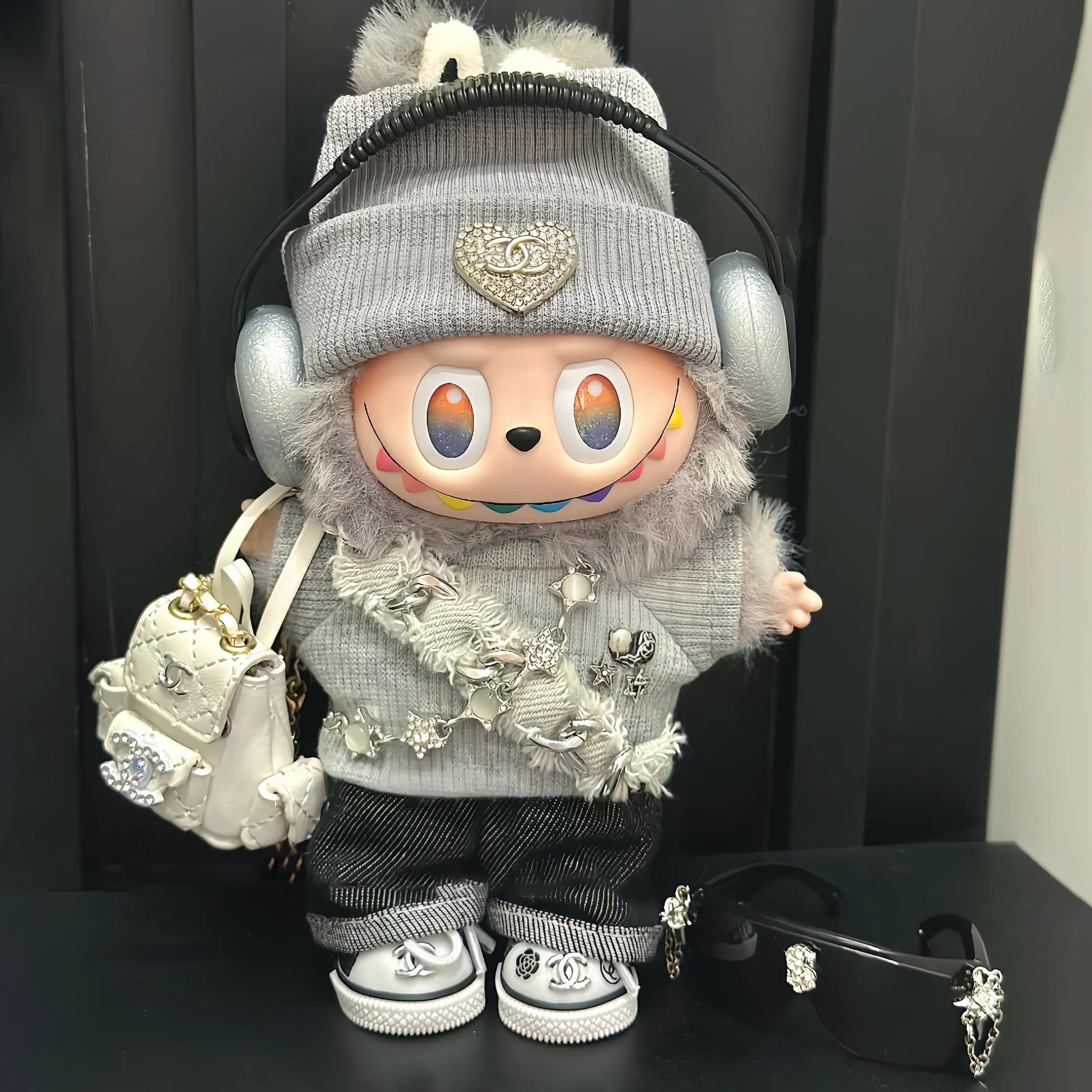 貴公子スタイル!都会的な モード フルセット♡ Labubu 8点セット Labubu モノトーン グレー コーデ ショルダーネックレス 付属 上品 クール 15cm 17cm 高品質 フルセット ラブブ 15cm 17cm こだわり