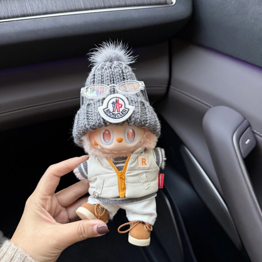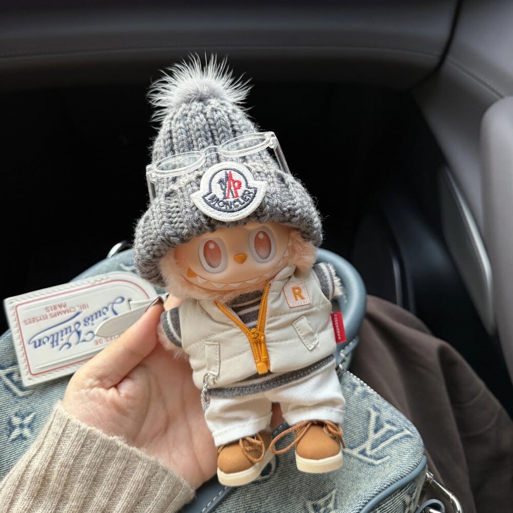 冬の新作でふわふわなオリジナル衣装♡ダウン風 ラブブ Labubu 1.2.3 ダウンコーデ♪ ニット帽&ストライプベストセット 15cm 17cm 対応