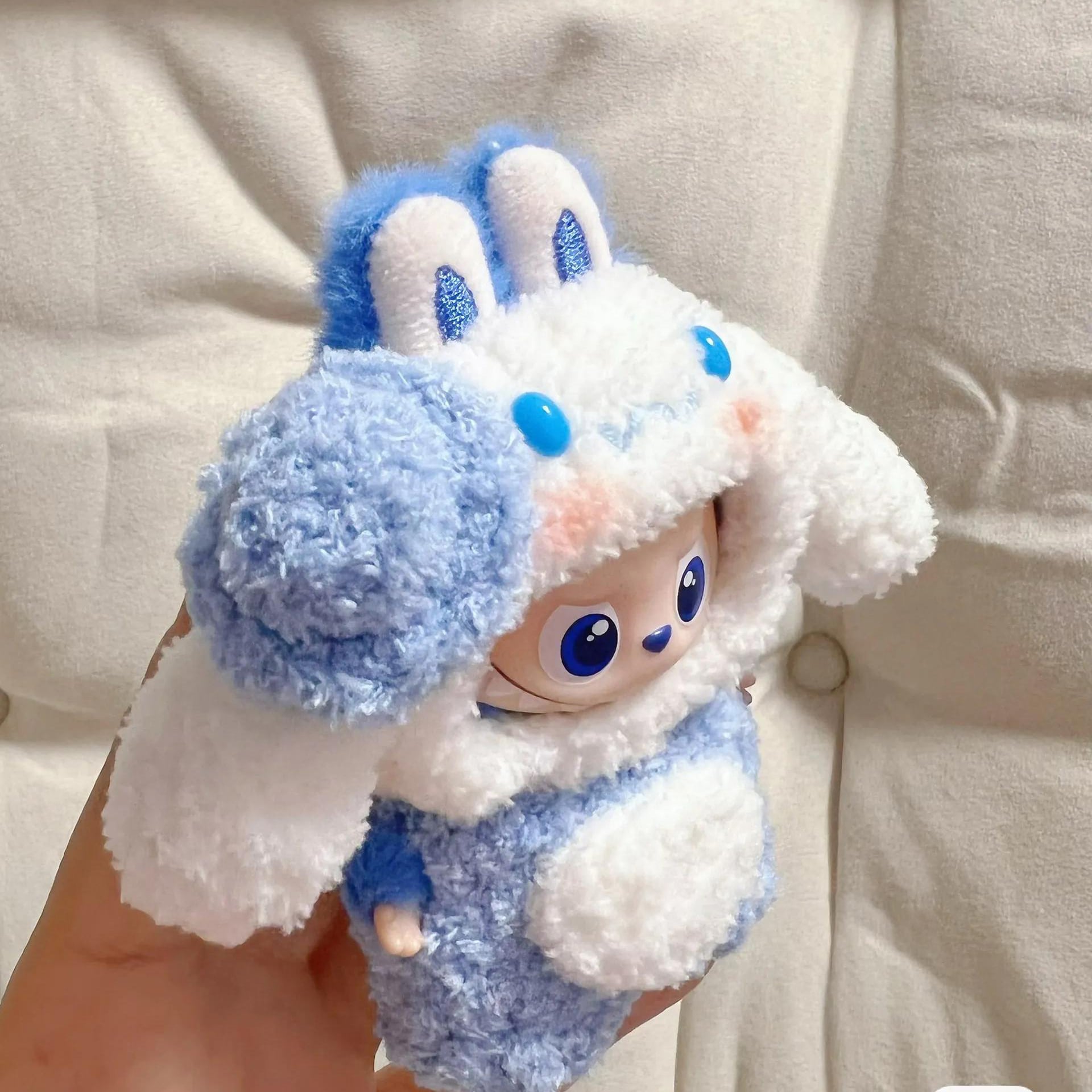 癒しのデザインがSNSで話題!モダンで可愛いワンさん♡ labubuラブブ4.0用 10cm ブルー&ホワイト 上質な仕上げ おしゃれ 上質 ドール服