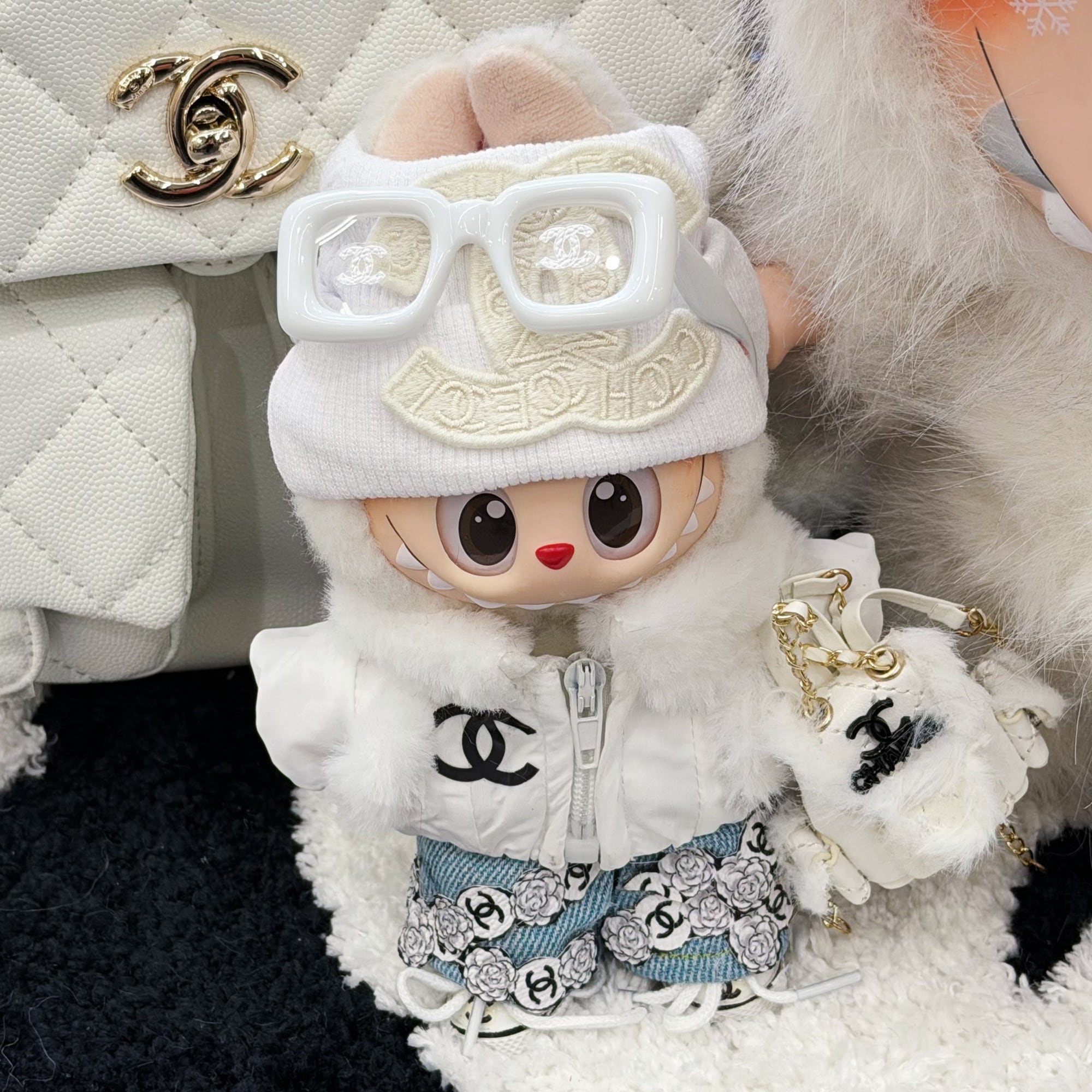 【商品名】メガネがワンポイント!冬のおしゃれ♡ labubu ラブブ 冬のドール衣装 プレミアムホワイト フルコーデ 15cm/17cm シンプルでおしゃれ