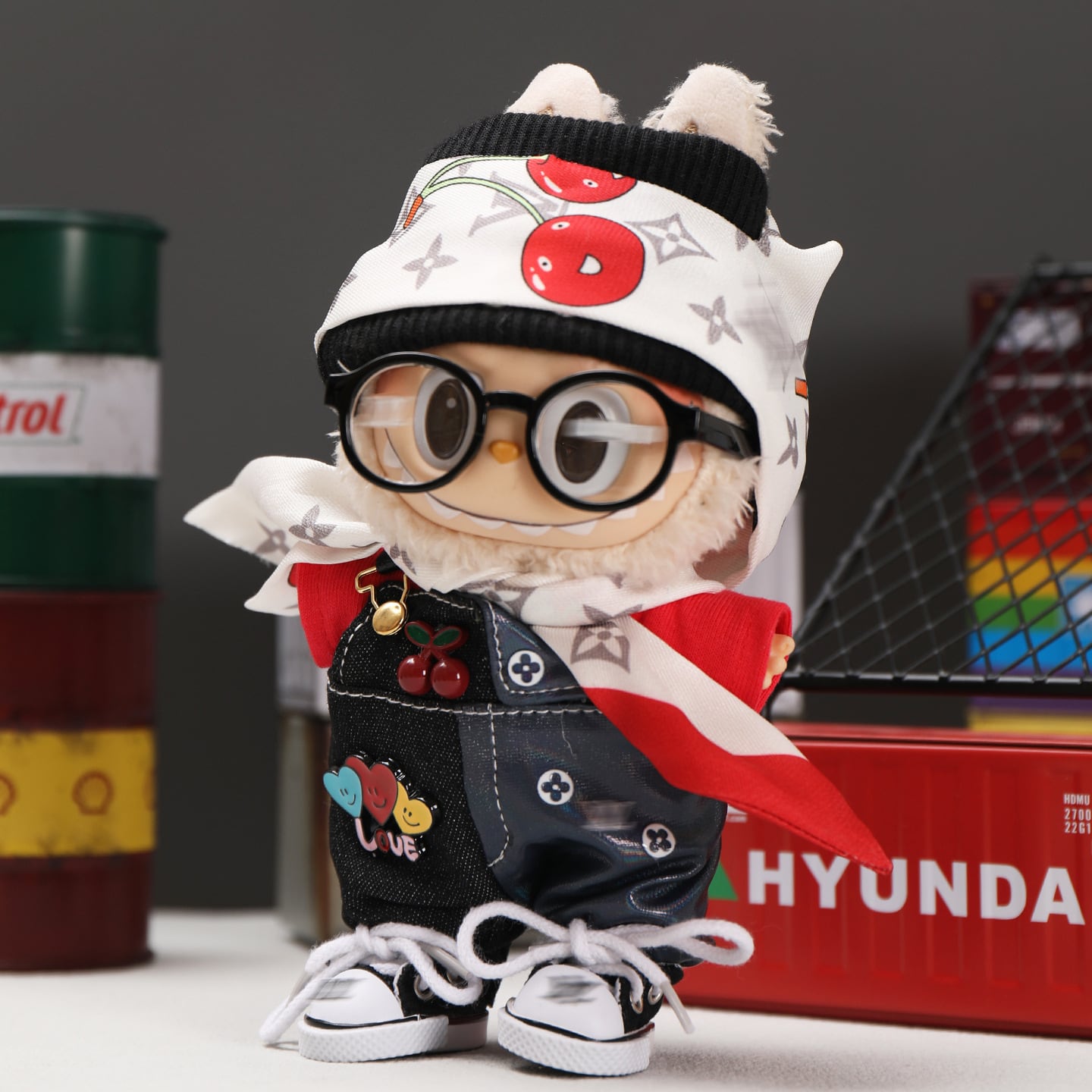 高級感あるこだわりコーデ!labubu ゴージャスで上質な ラブブ チェリーコーデ 7点フルセット - 1・2・3世代 15cm17cm兼用 スカーフ付き スタイリッシュ ドール服