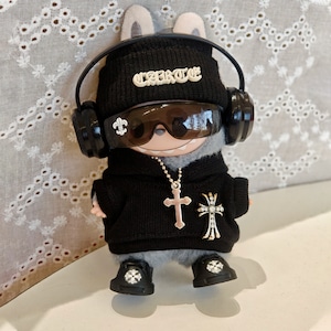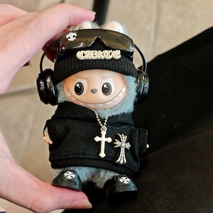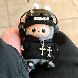 全ブラッククールスタイル!ネックレス付き♥ Labubu 4.0 10cm 全6点ブラックコーデセット クール 可愛い 着せ替え