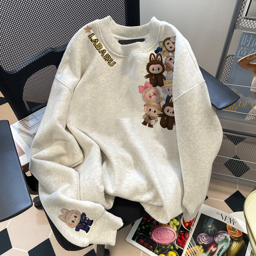 めっちゃ可愛い!labubu ラブブ カートゥーン クルーネックセーター ゆったり 着やせ 長袖 男女兼用 起毛/シングル選択可