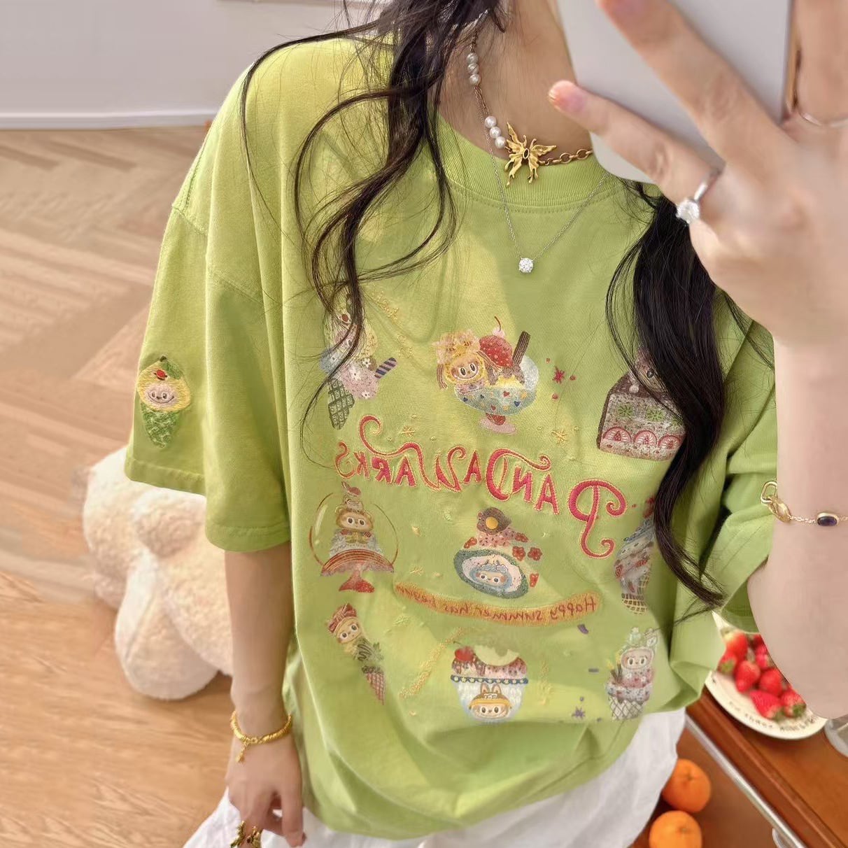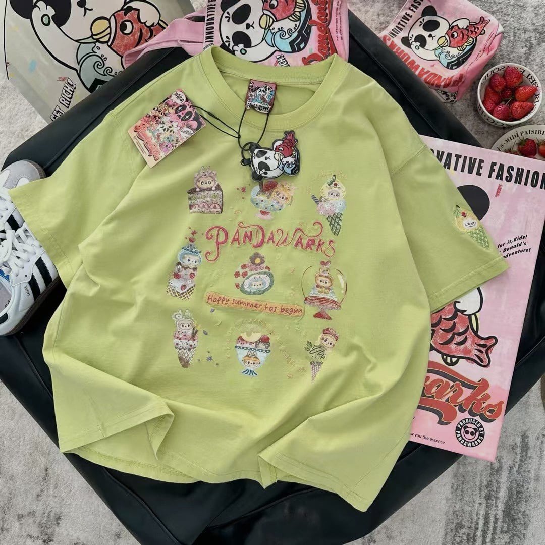 Pandawarks×Labubu「スイートアイスクリーム」デザイナーズTシャツ 癒し系カジュアル 綿100% 高品質刺繍 プレミアム 半袖 ユニセックス ラブブ
