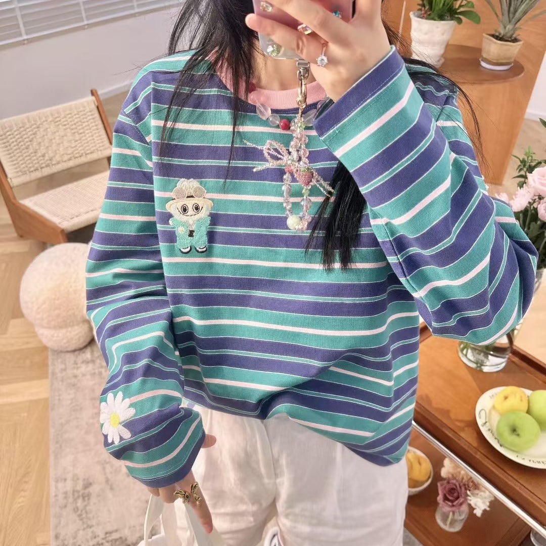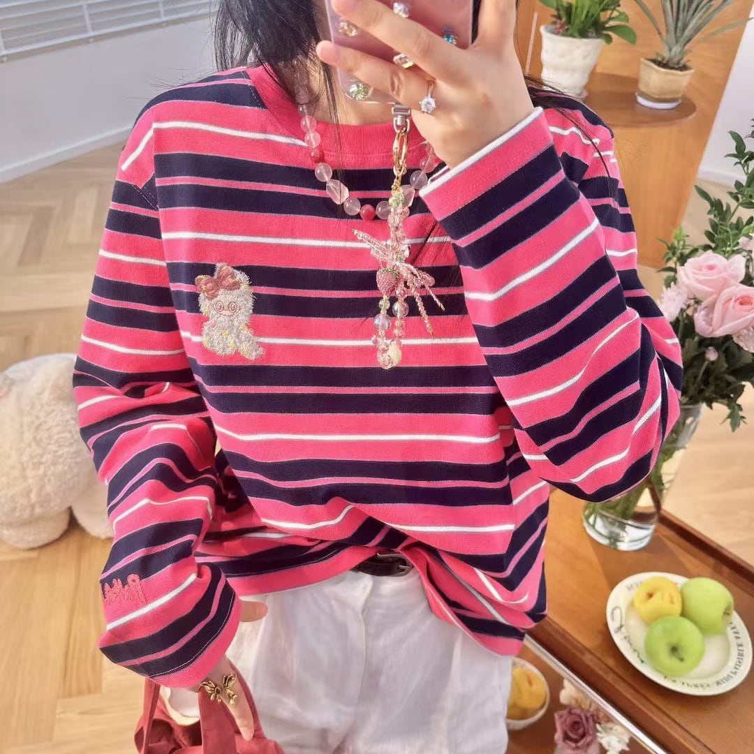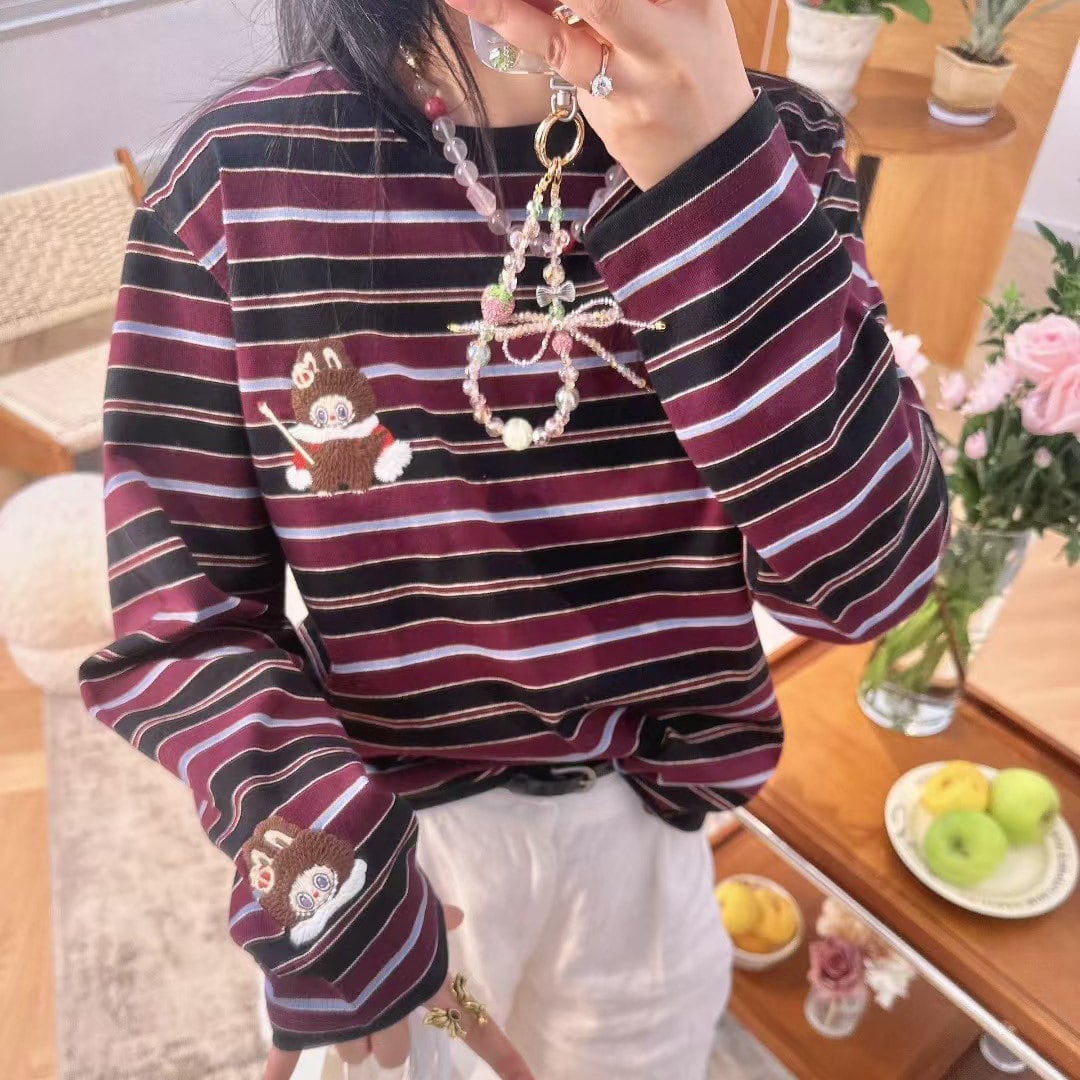 Pandawarks×Labubu「ストライプ」長袖Tシャツ 袖口&胸元ダブル刺繍 綿100% シンプル ストリート ゆったり ユニセックス