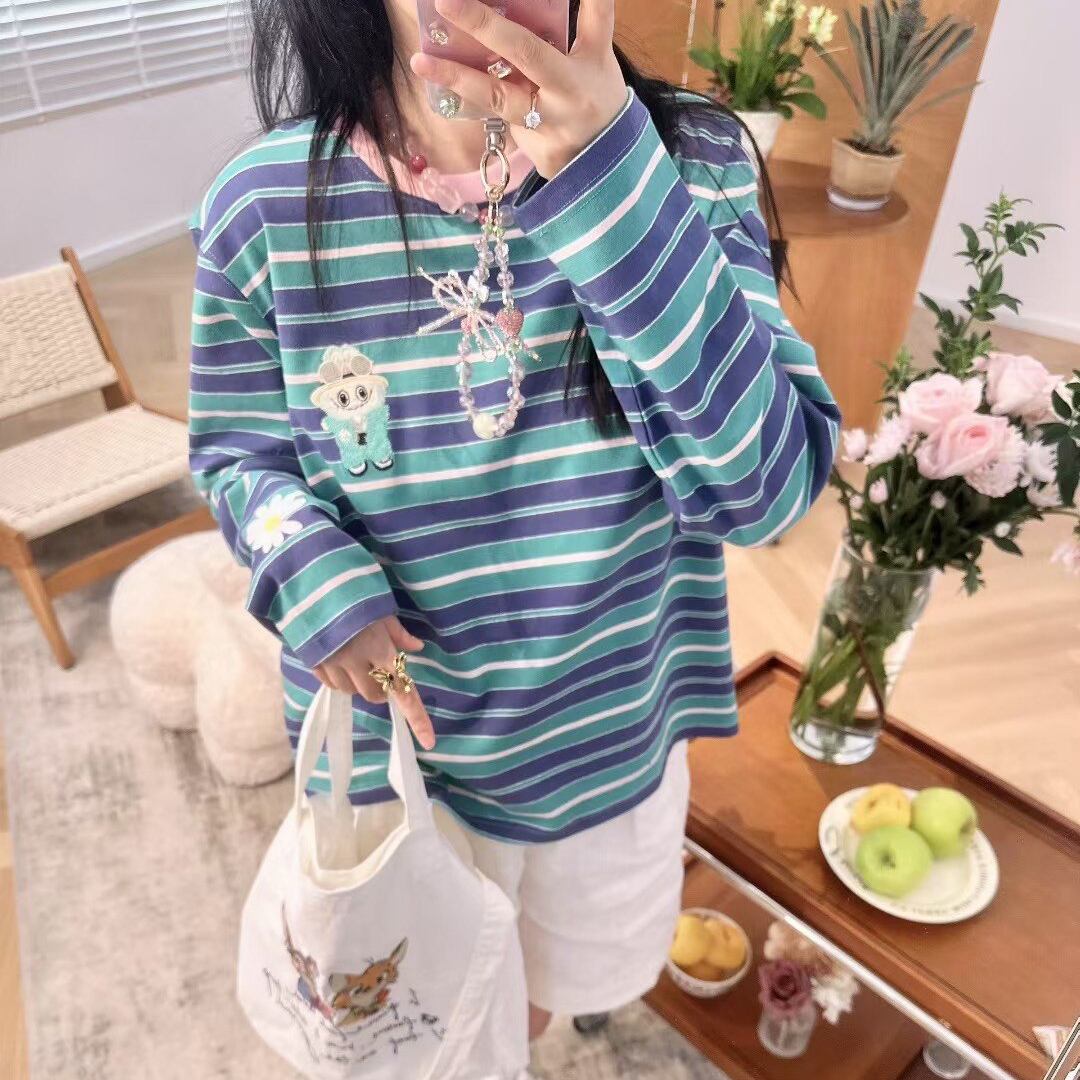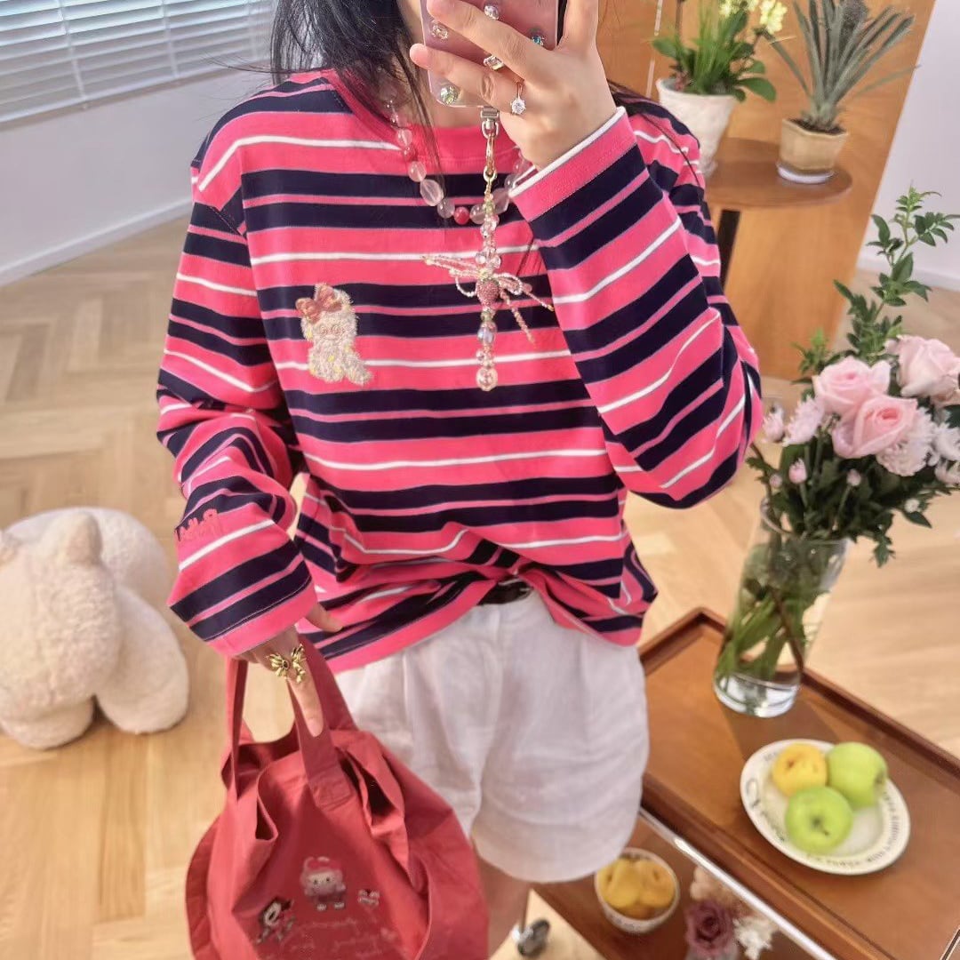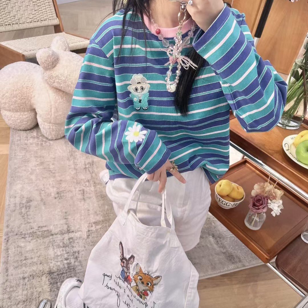 Pandawarks×Labubu「ストライプ」長袖Tシャツ 袖口&胸元ダブル刺繍 綿100% シンプル ストリート ゆったり ユニセックス