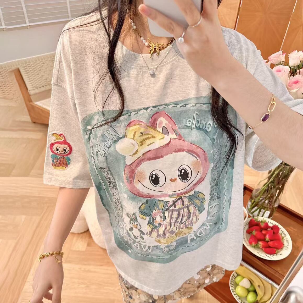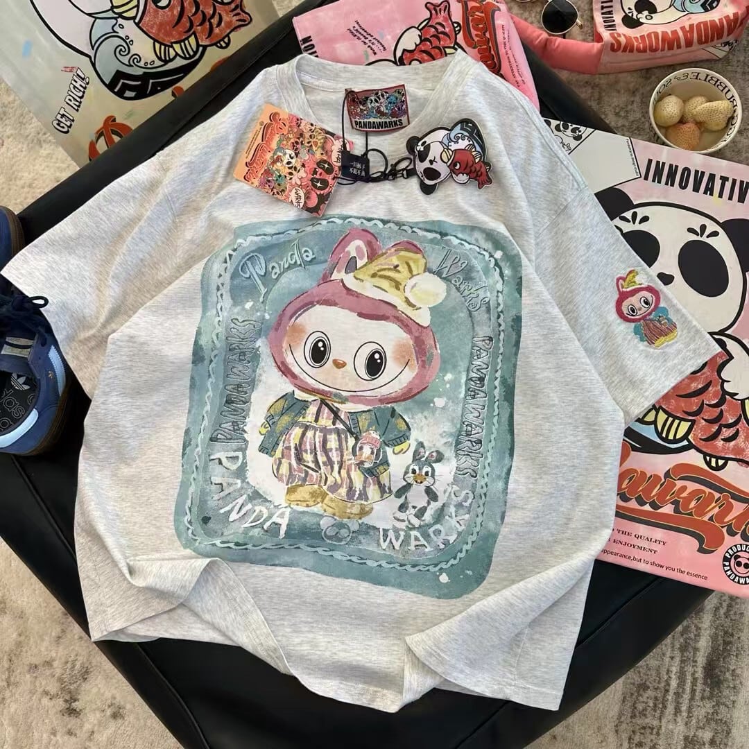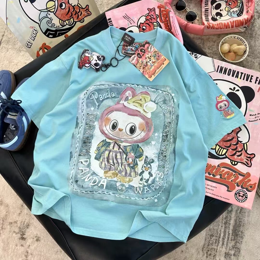 Pandawarks×Labubu ゆったり着心地 プリントTシャツ 半袖 クルーネック 綿100% 薄手 かわいいデザイン レディース トップス