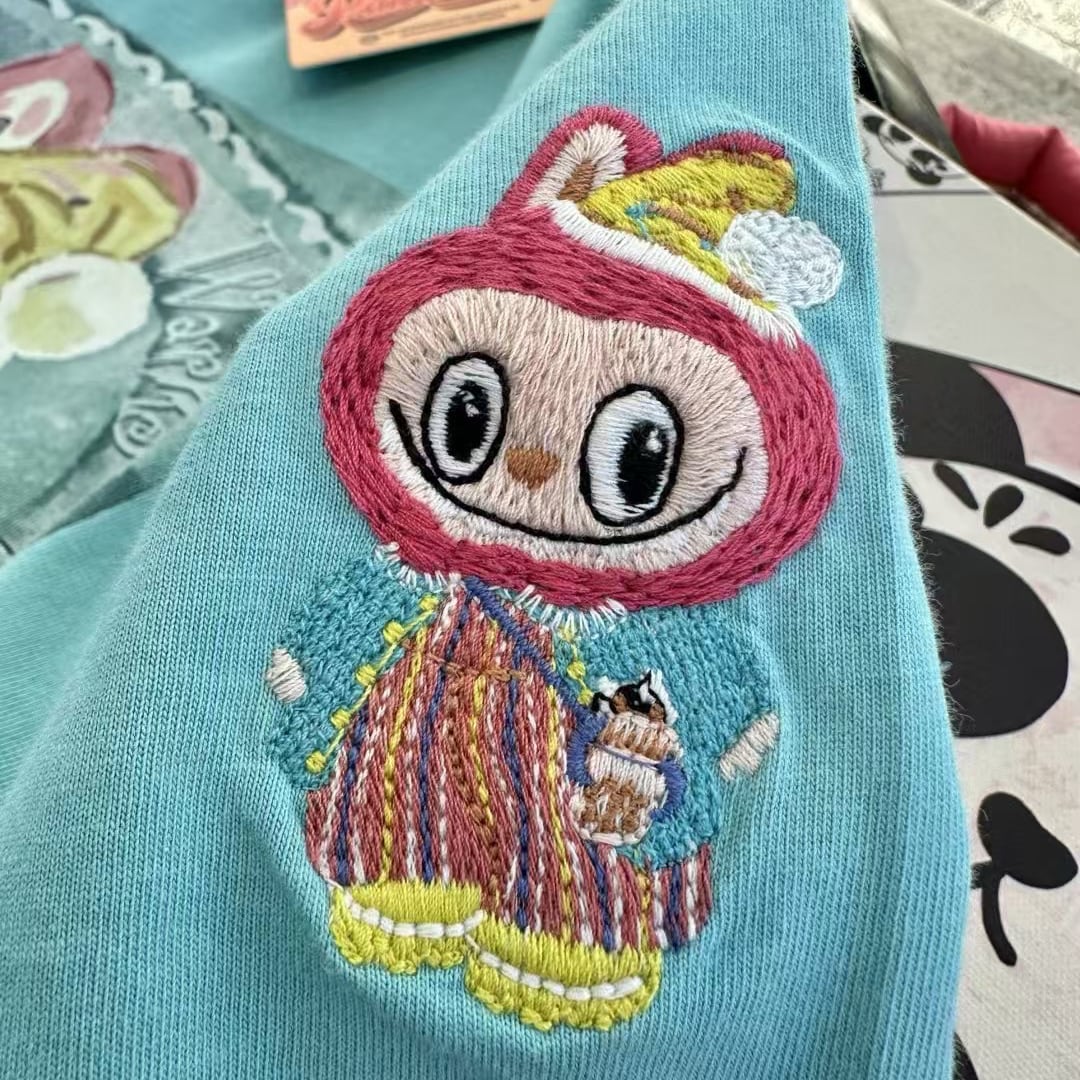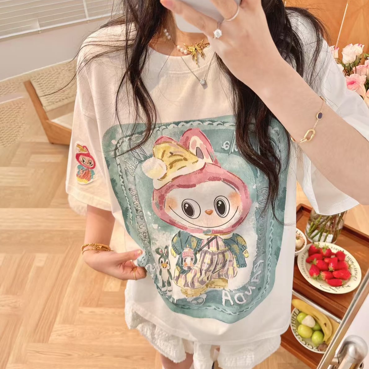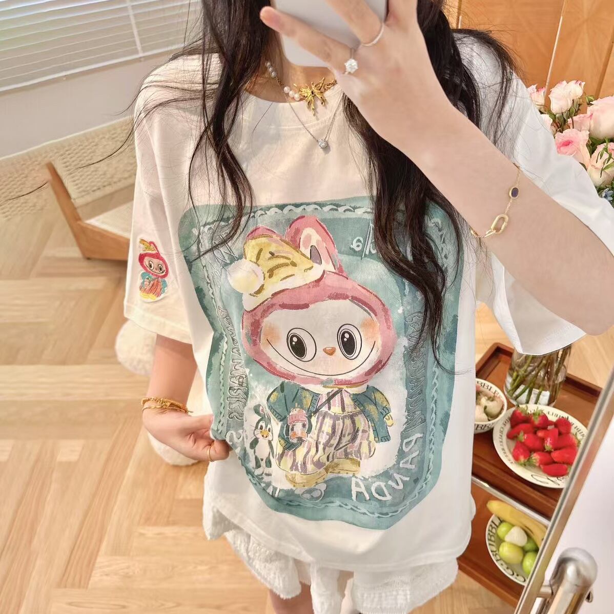 Pandawarks×Labubu ゆったり着心地 プリントTシャツ 半袖 クルーネック 綿100% 薄手 かわいいデザイン レディース トップス