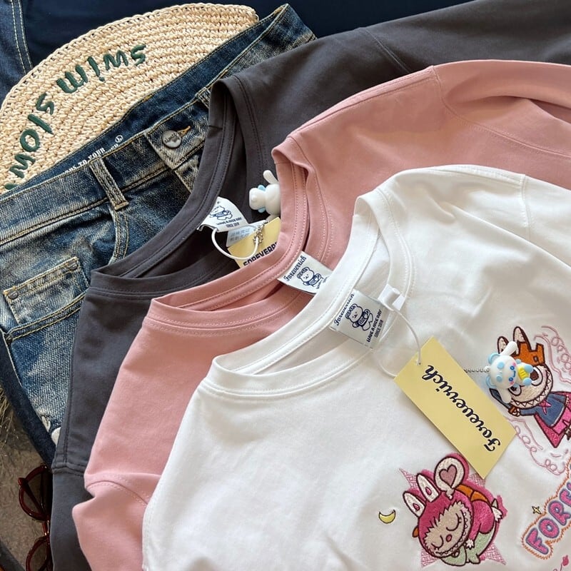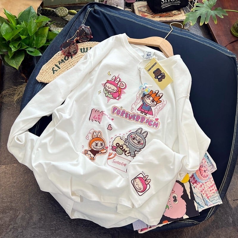 Pandawarks×Labubu LAラブブ限定♡刺繍ロゴTシャツ オーバーサイズ 長袖 綿100% かわいい 若見え 秋冬 カジュアル 厚手 肌触り 抜群