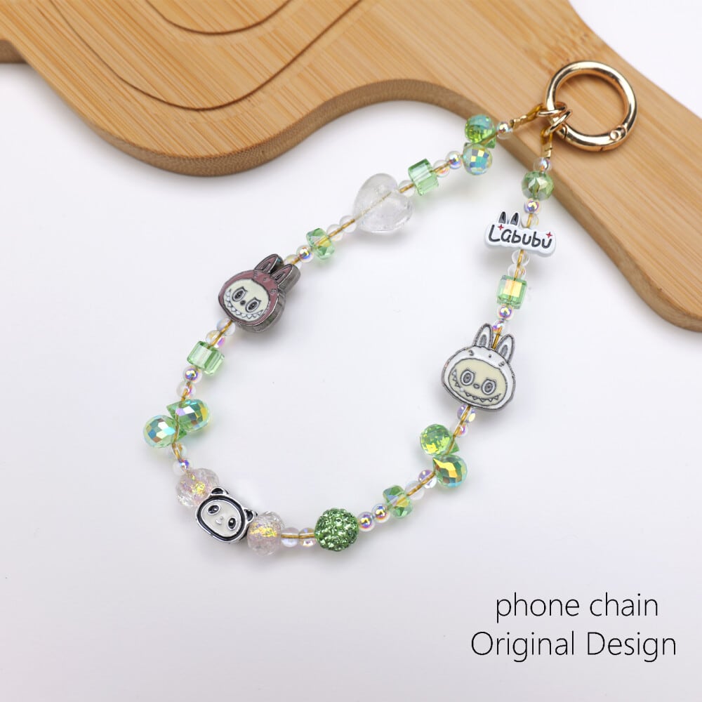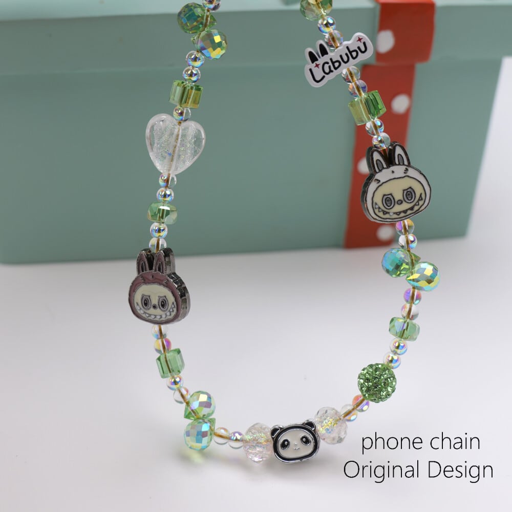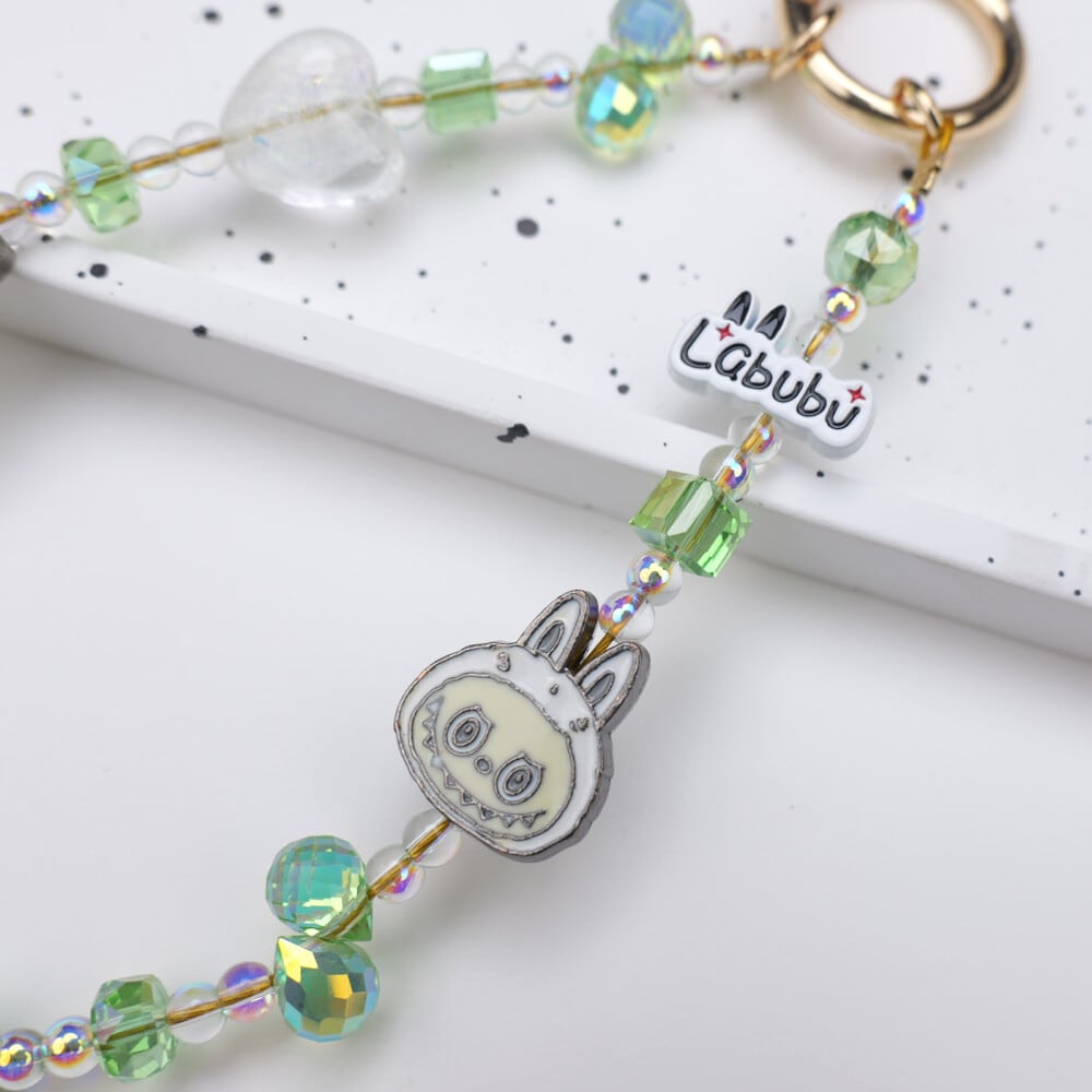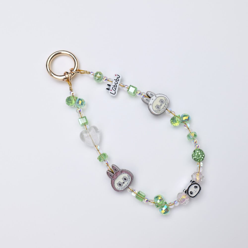 てるてるパンダ!Labubu ラブブ パンダ グリーン 清新 ストラップ 合金製 多機能 キーホルダー/ポーチチャーム/ブレスレット 水晶アクセ付き