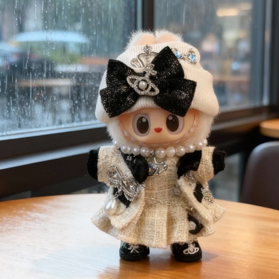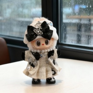 貴族の令嬢スタイル!高級感溢れる白黒コーデ♡ ラブブ The monsters 1.0/2.0/3.0 対応 エレガント ゴージャス Labubu チェーンウエストポーチ&ネックレス付き 上品なツイード素材 15-17cm用