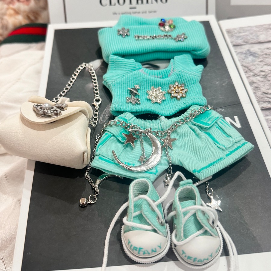 上質ブルーで差をつける!大人かわいい個性派コーデ✨Labubu 鮮やかブルー7点セット シューズ&バッグ付き クールで可愛い 15-17cm用 1・2・3世代対応 ラブブ the monsters