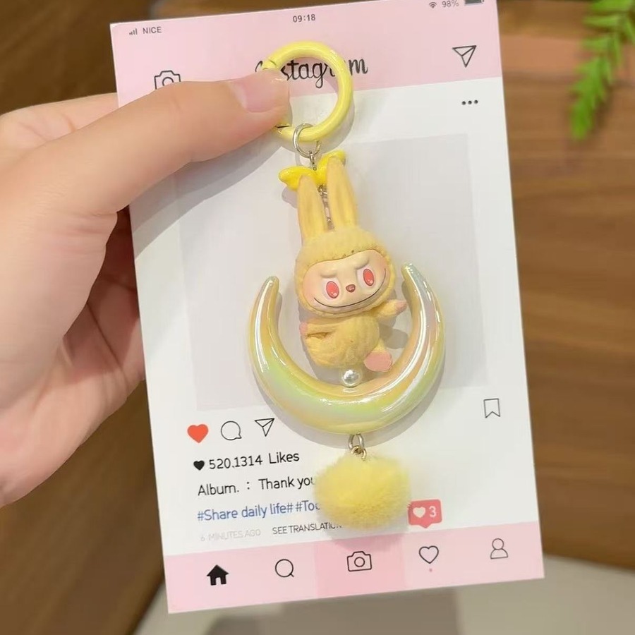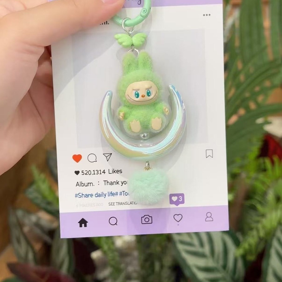 夢見る月の舟♡ 4色展開 Labubu メッキ&ふわふわポンポン キーホルダー バッグチャーム 親友やカップルにぴったり 可愛い
