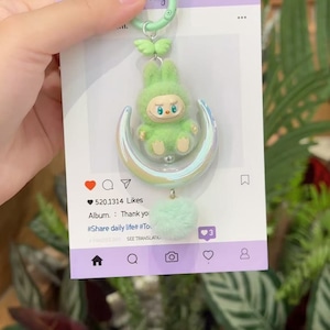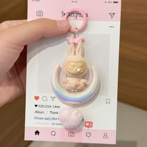 【商品名】夢見る月の舟♡ 4色展開 Labubu メッキ&ふわふわポンポン キーホルダー バッグチャーム 親友やカップルにぴったり 可愛い