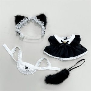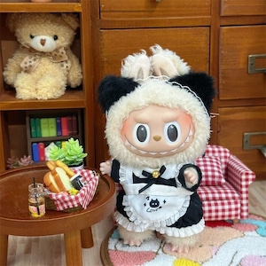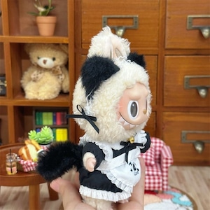 萌えキュン!Labubu 15-17cm用 ラブブ用 猫耳メイド服 着せ替えセット 黒白 ふわもこしっぽ付き かわいい 萌え コスチューム