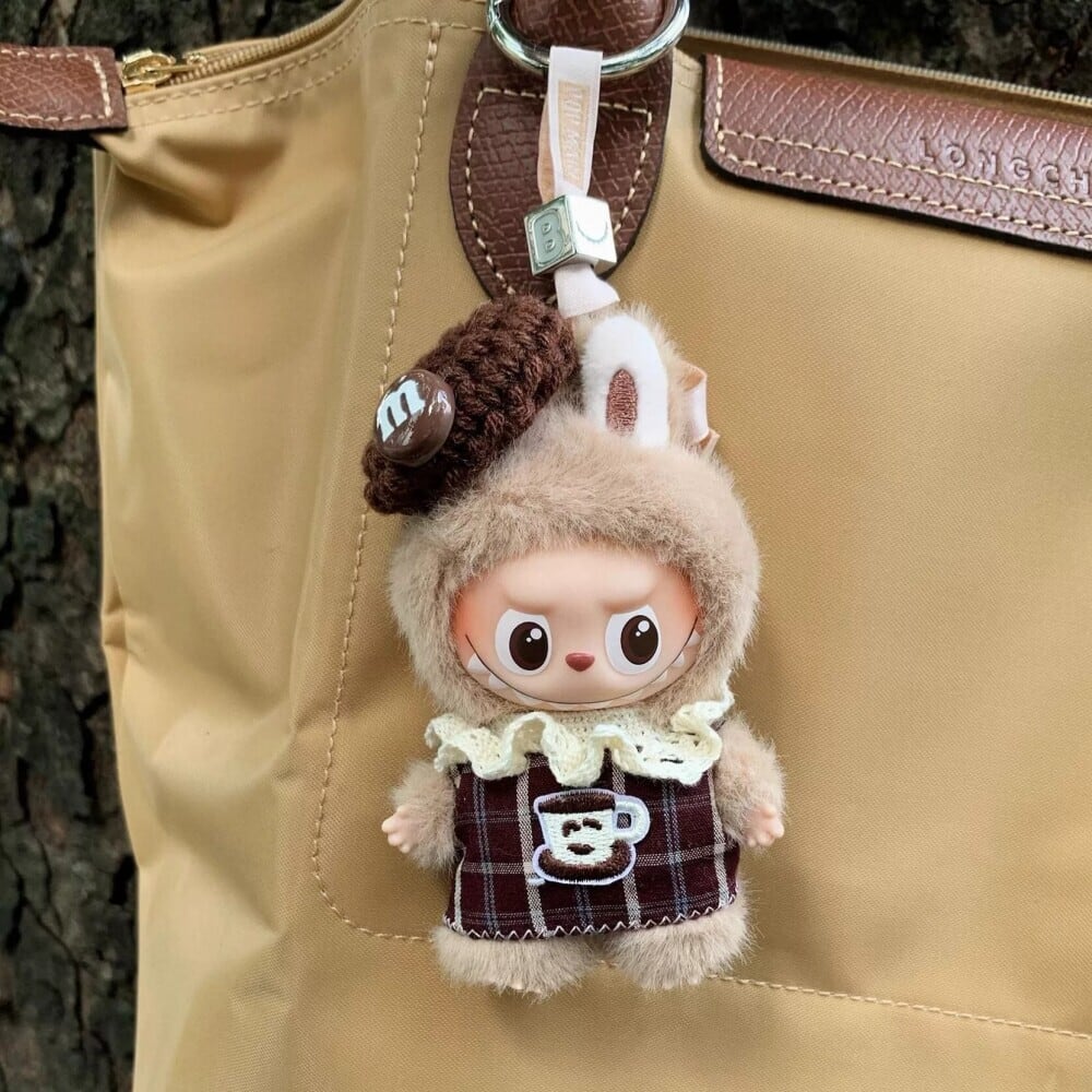 刺繍カップがポイント!ほっこり可愛い♡ Labubu ラブブ4.0 10cm専用 ドール衣装 コーヒー色のあたたかみ 激カワ 癒し系コスチュームセット