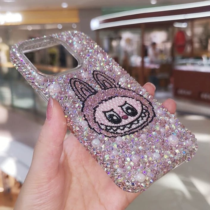 一点物の輝き!チェコ産プレミアムストーンを散りばめた、ラブブのハンドメイドiPhoneケース。上品なピンクのグラデーションと360度全面ガードが洗練された大人可愛さを演出。iPhone 17 Pro Max/16 Pro Max/15 Plus/14/13 シリーズ対応。