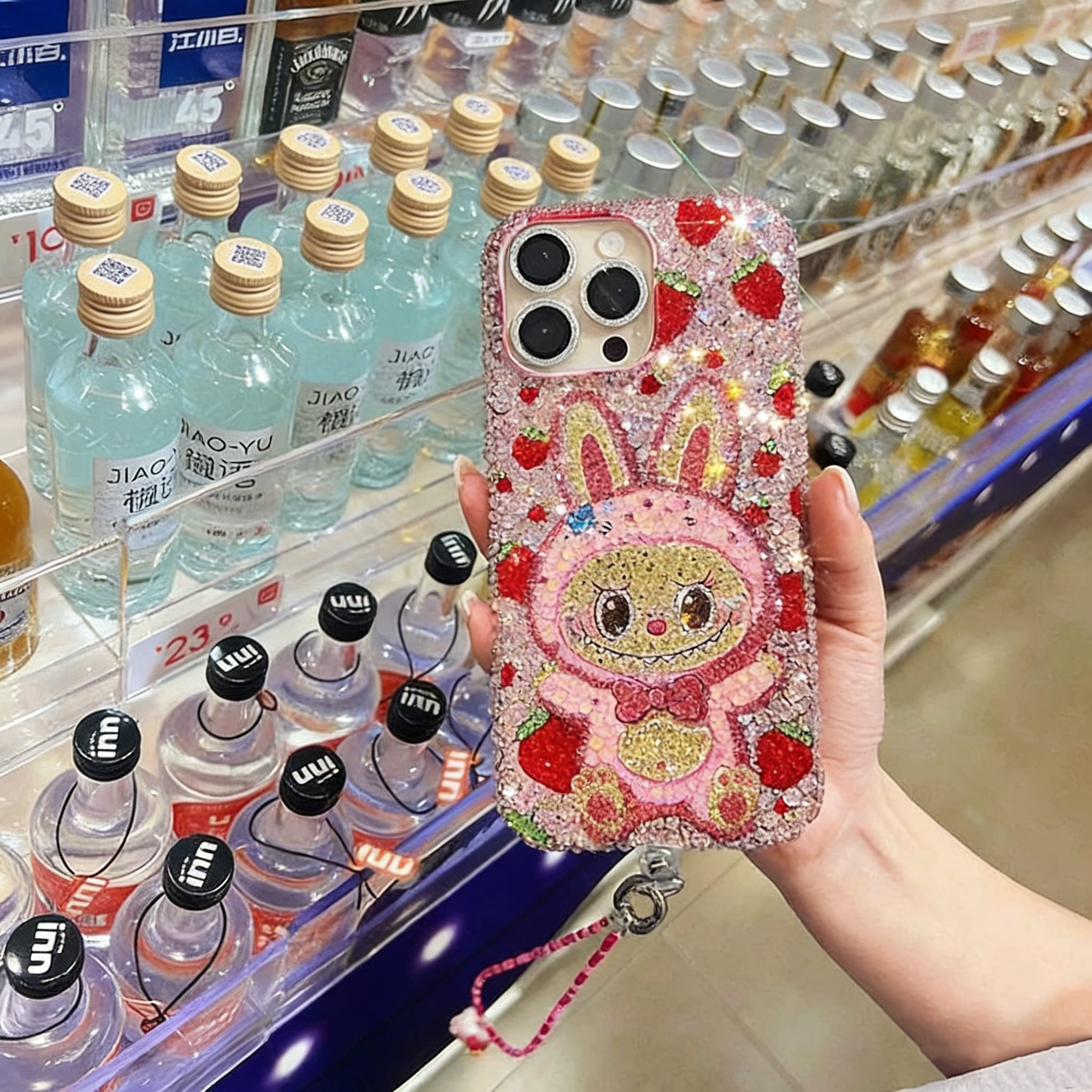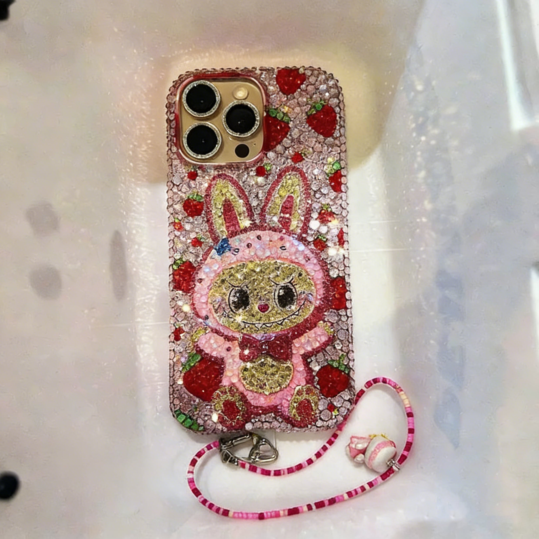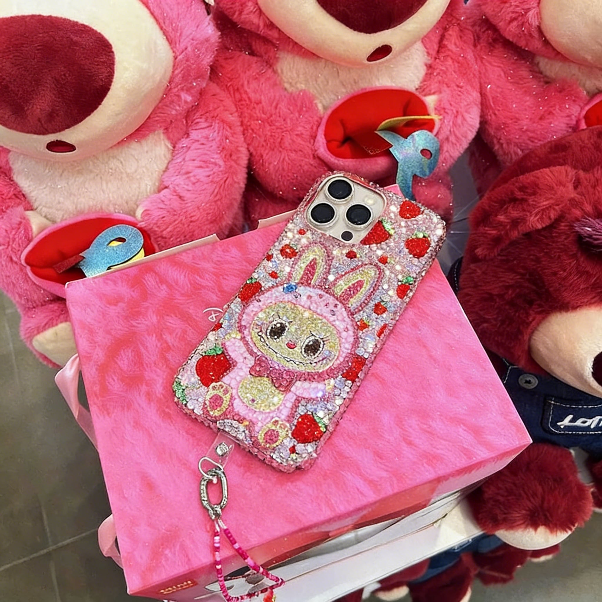 iPhone・Android全機種対応♡ ✨超かわいい!ストーン全面施し 高級感ある!Labubu ラブブ いちご デザイン ✨ フルストーンでキラキラ輝く スマホケース