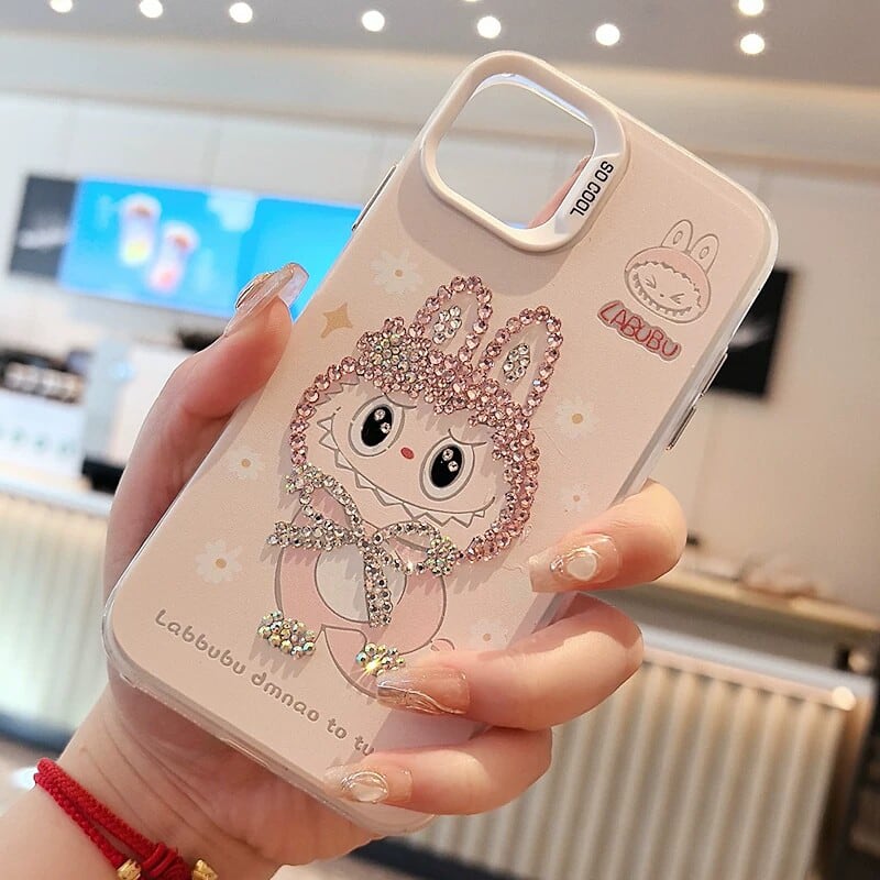 ピンク系 可愛い!ピンク色のラブブ Labubu キラキラストーン ふわふわ縁 iPhone ケース 全面保護 抜群の手触り 防衝撃/16Pro Max対応