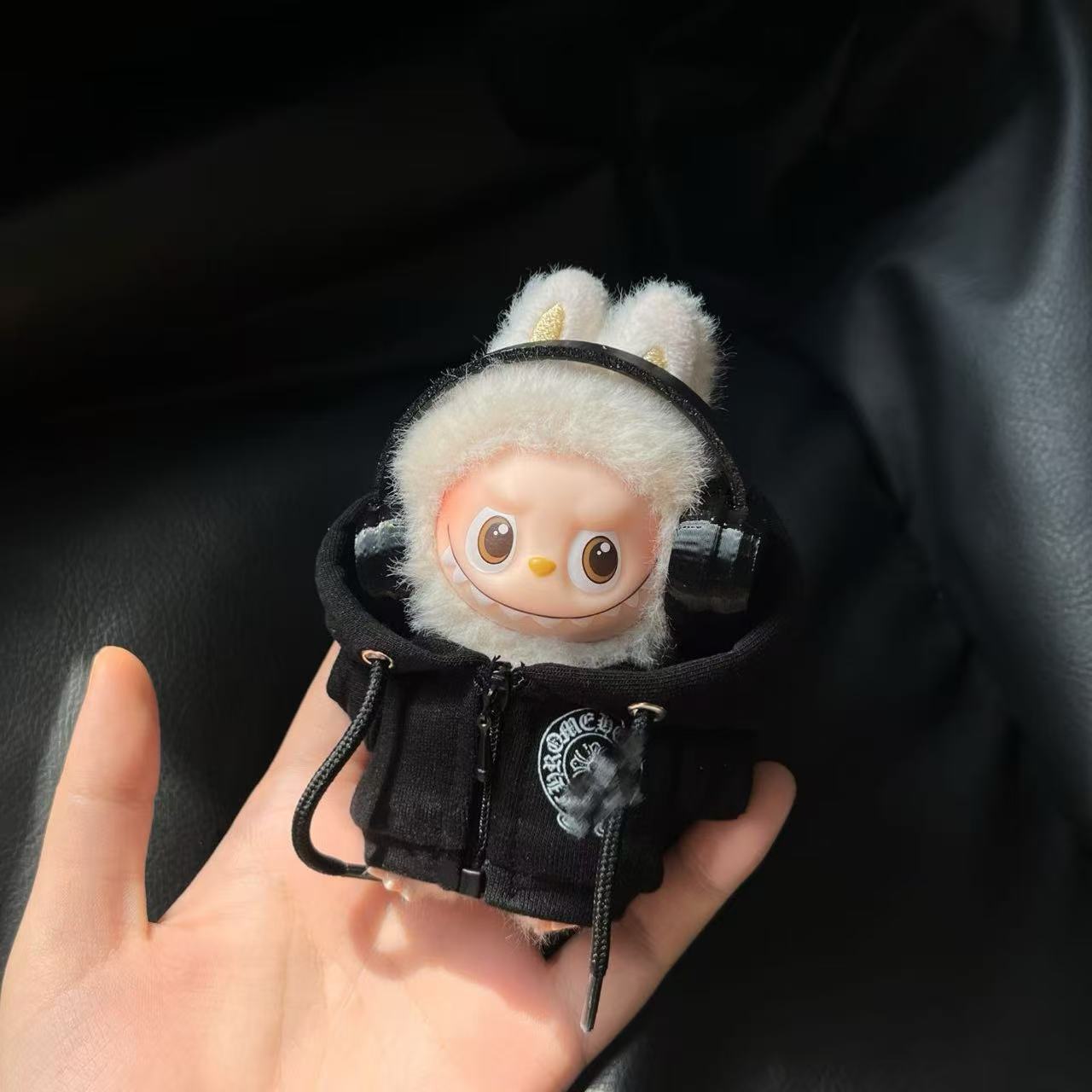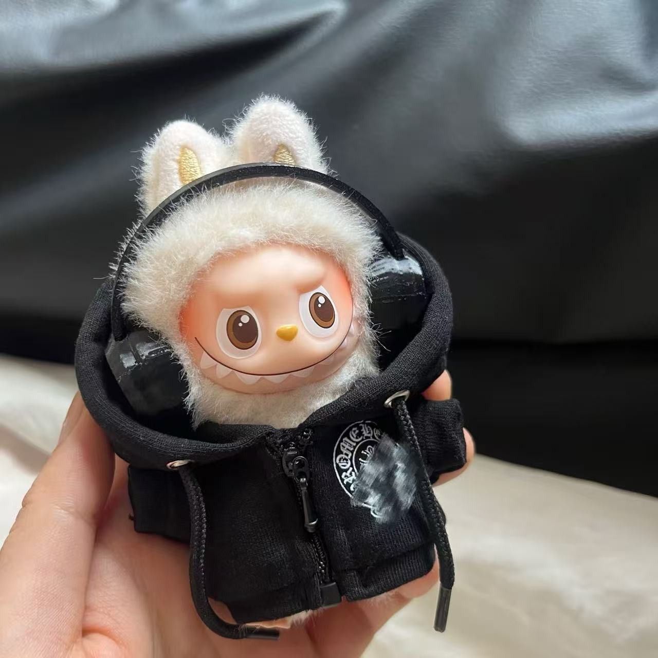 クールで可愛い!おしゃれ プリント♥ Labubu 4.0 10cm 用 ブラック パーカー コーデ セット イヤホン付き シンプル おしゃれ かわいい 着せ替え