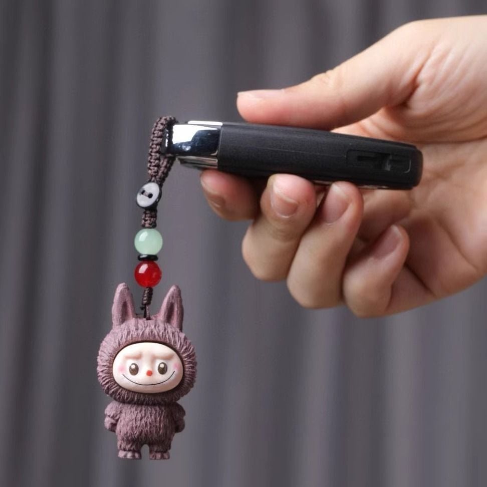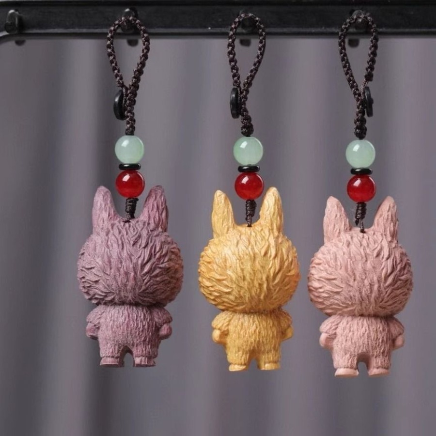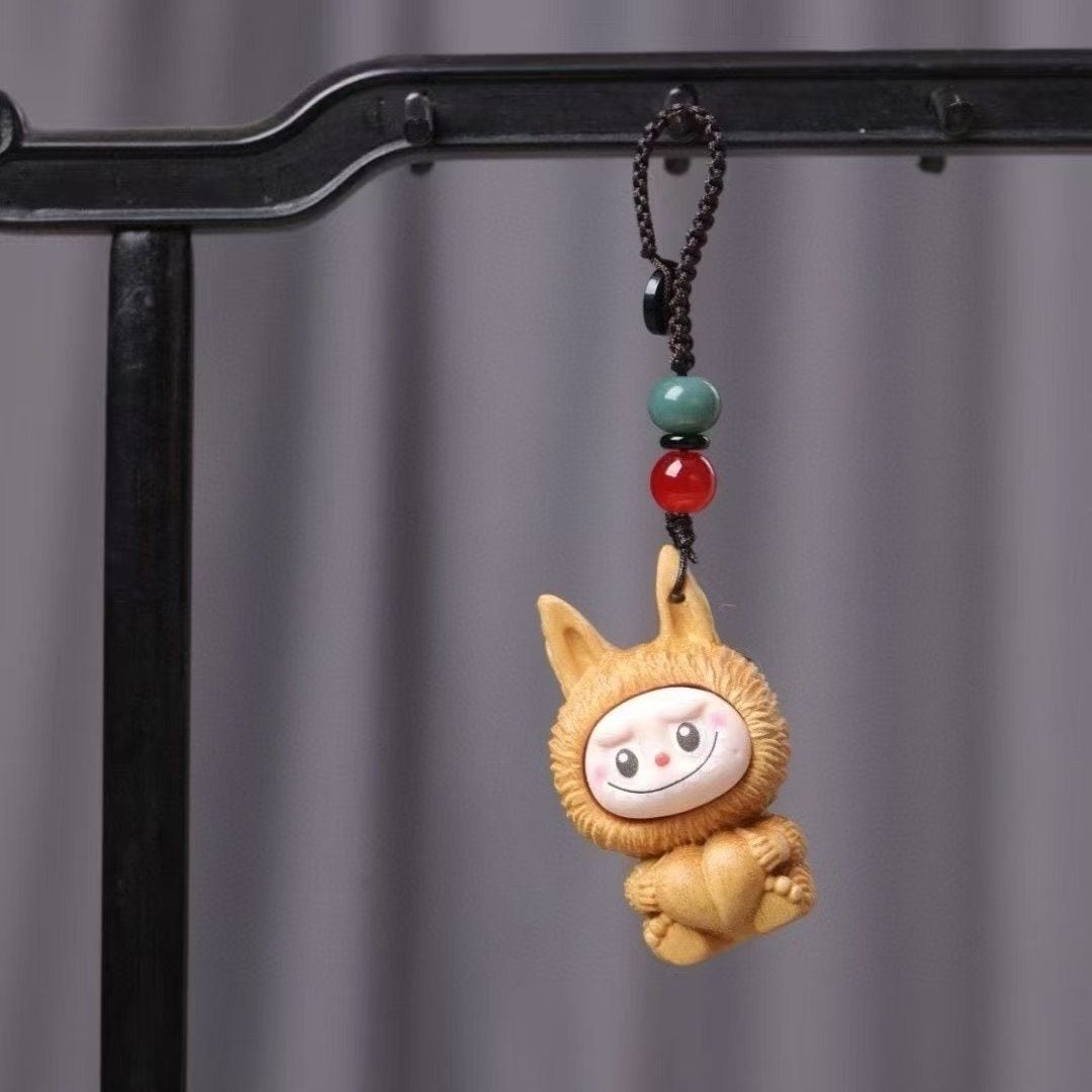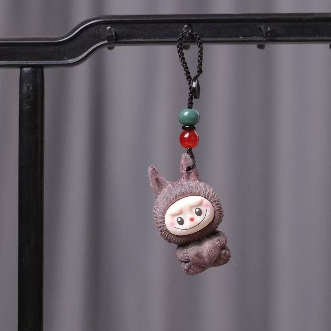 激カワの木彫り「ラブブ」ちゃんキーホルダー!シタン木彫り 可愛いlabubu 立体キーホルダー ストラップ 可愛い キャラ バッグチャーム 車 プレゼント ユニーク