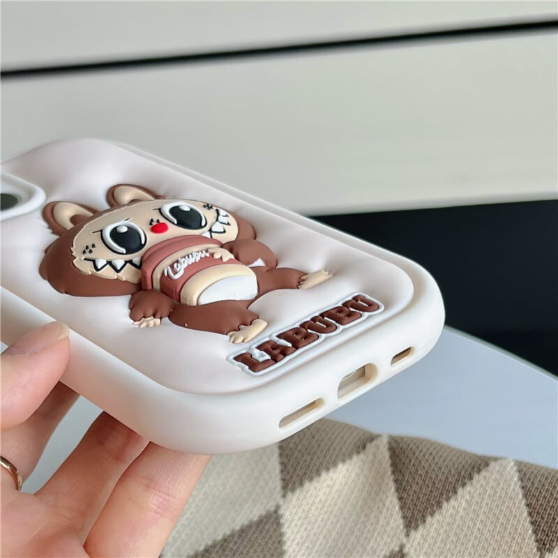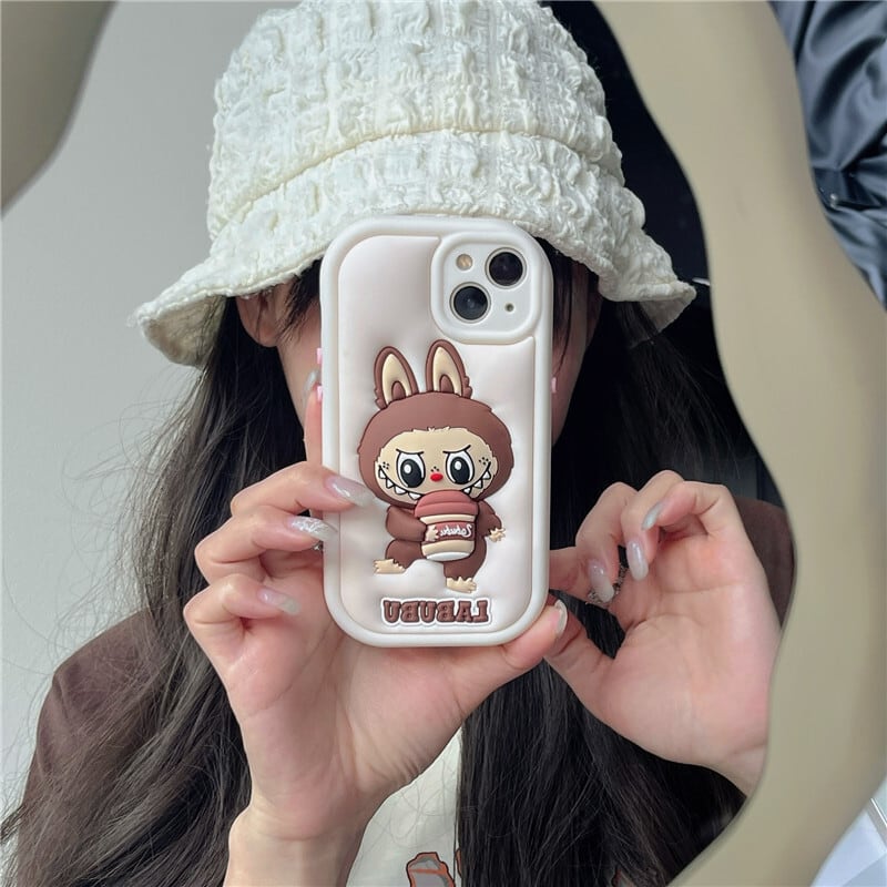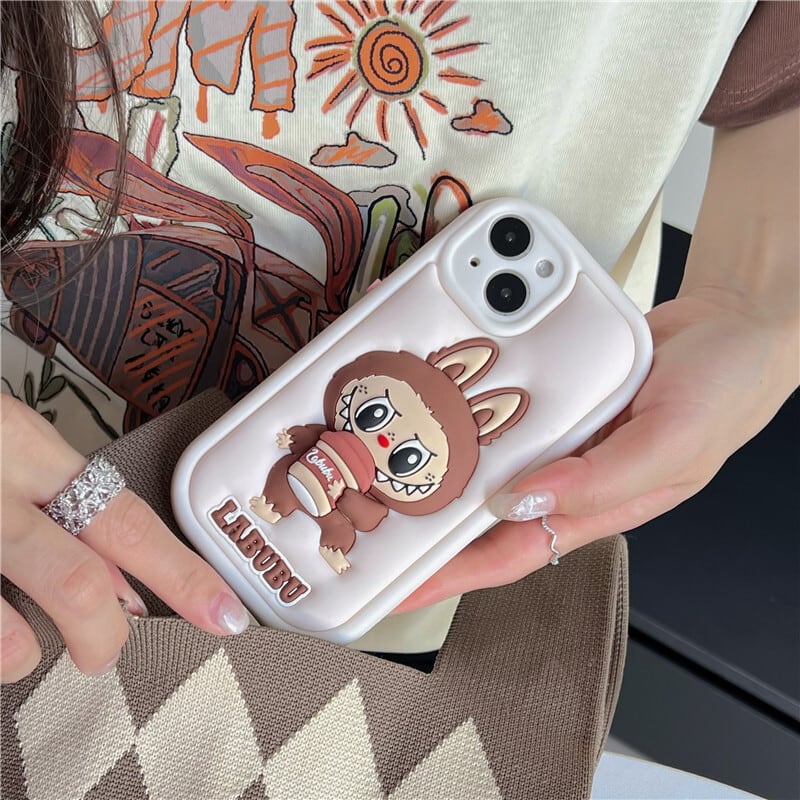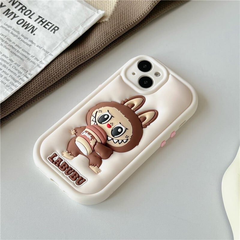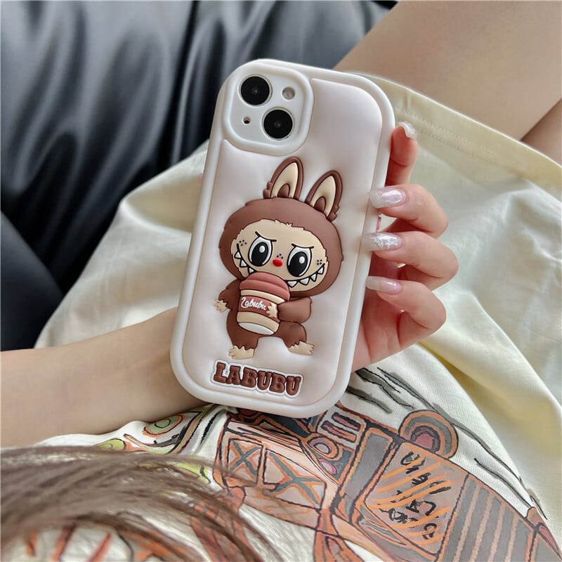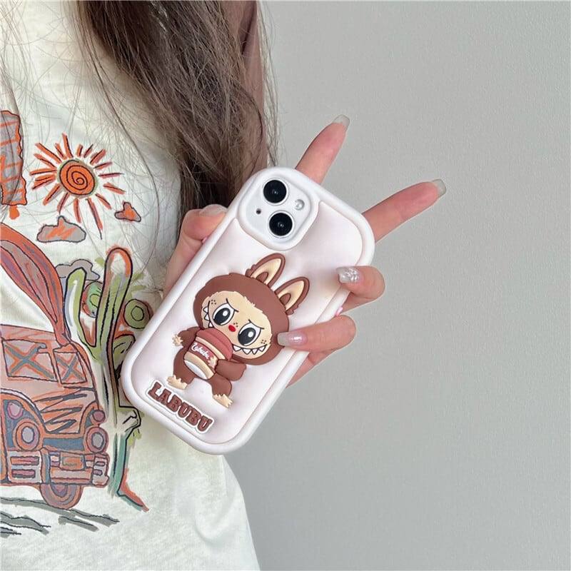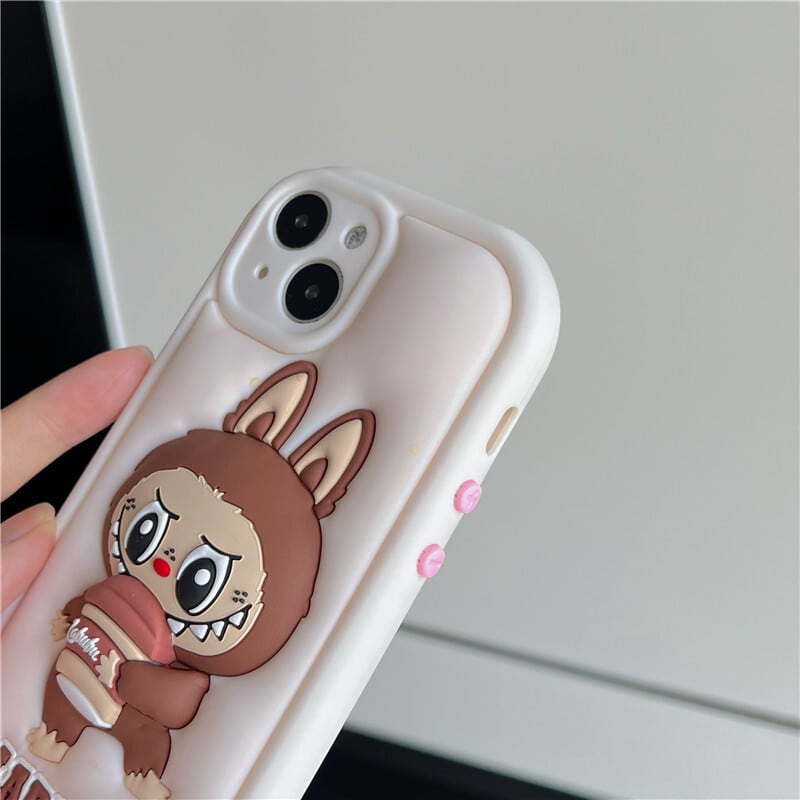 ピンク&ホワイト 立体ラブブ iPhoneケース 14Plus/13/15ProMax対応 耐衝撃 ソフトシリコン製 ふんわり可愛い labubu