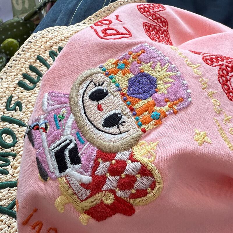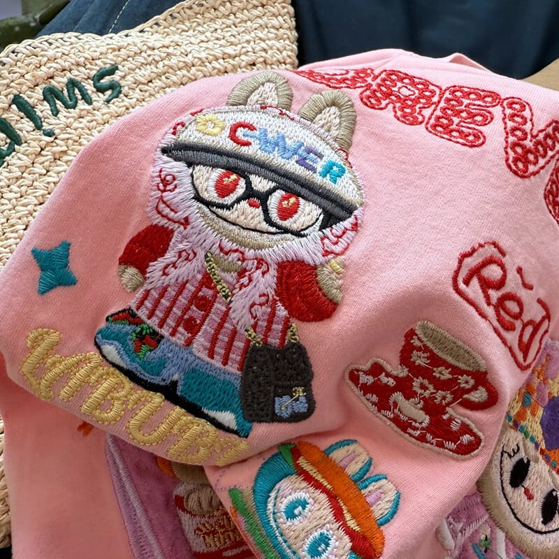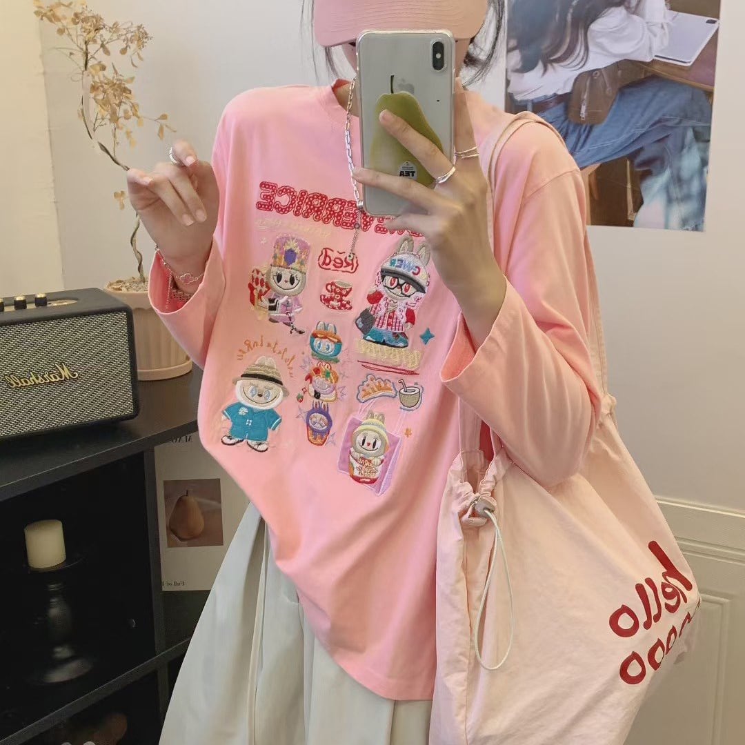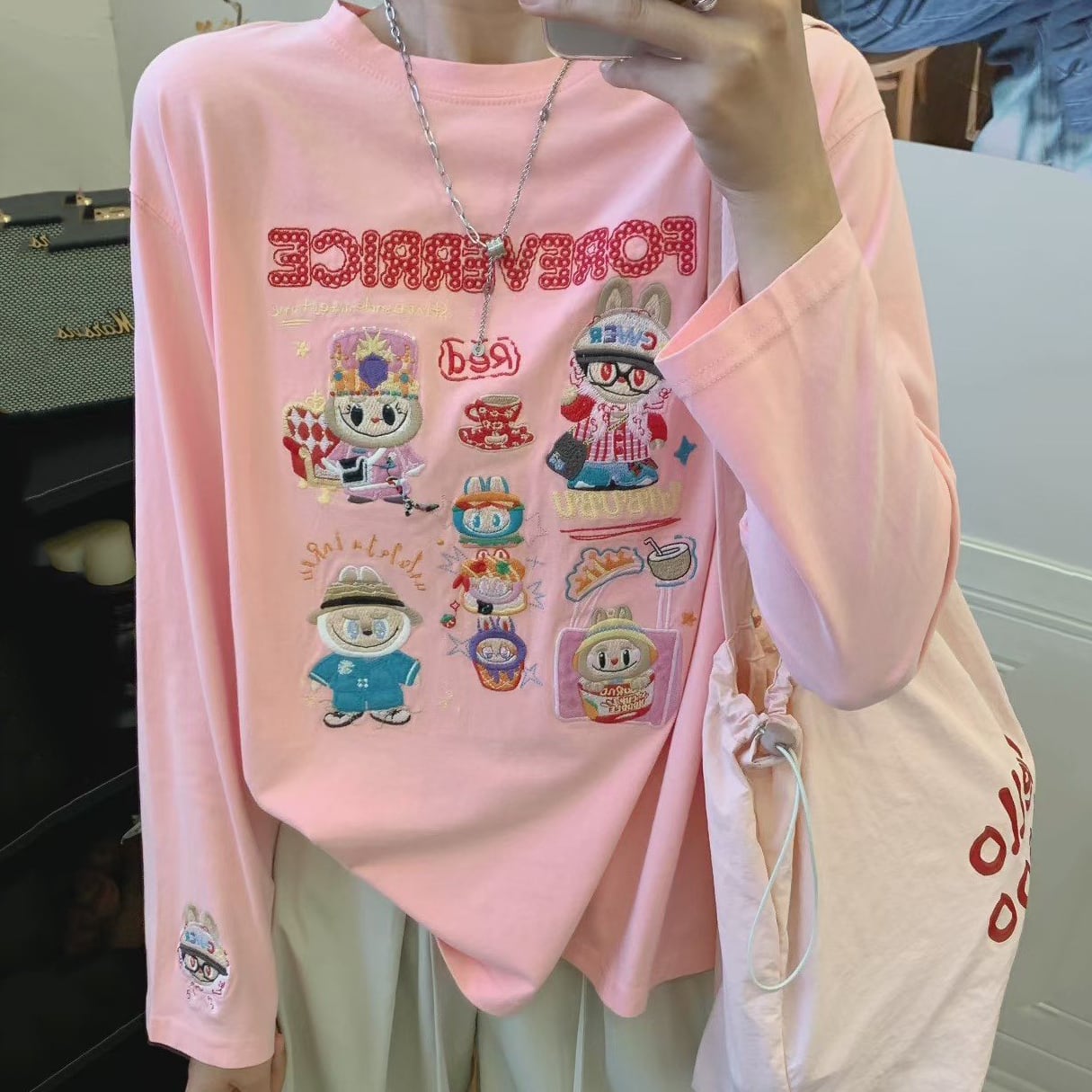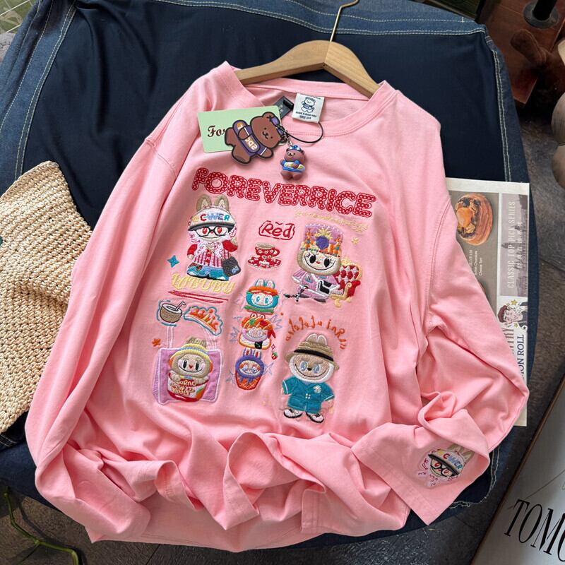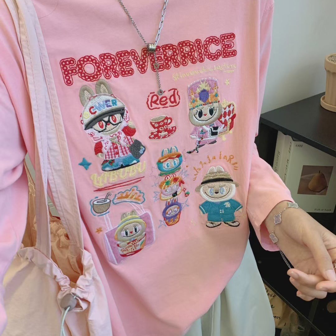 応援の気分を毎日に!Foreverrich×LABUBU 長袖Tシャツ ブラシ加工 コットン 重厚刺繍 フリーサイズ 肌触り良い レディース カジュアル ベーシック ラブブ