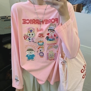 【商品名】応援の気分を毎日に!Foreverrich×LABUBU 長袖Tシャツ ブラシ加工 コットン 重厚刺繍 フリーサイズ 肌触り良い レディース カジュアル ベーシック ラブブ
