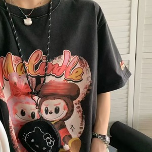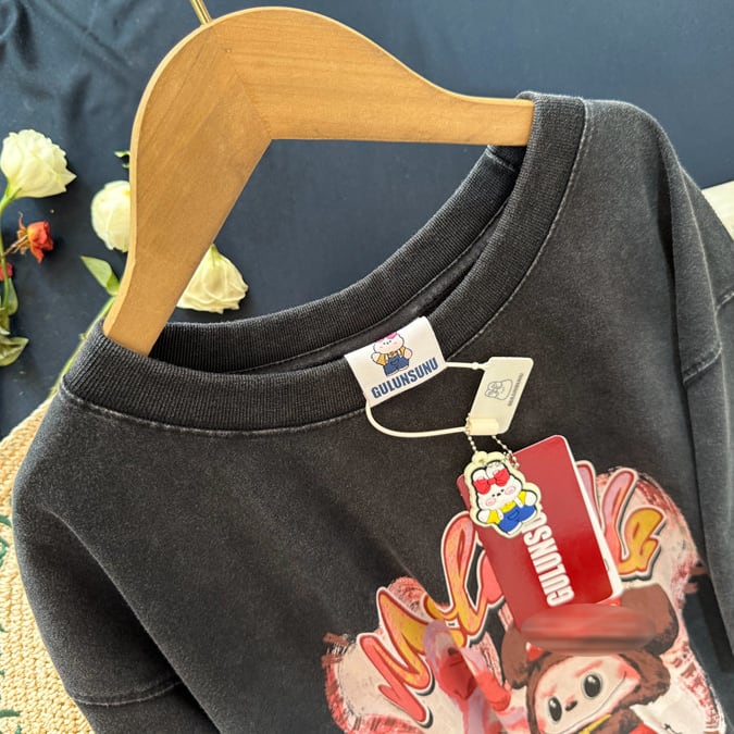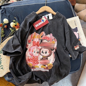 GULUNSUNU×LABUBU 200g コットンウォッシュ加工「ハッピーLABUBU」プリントTシャツ|ゆったり着心地・可愛いデザイン|45-75kg対応 ユニセックス半袖トップス メンズ レディース