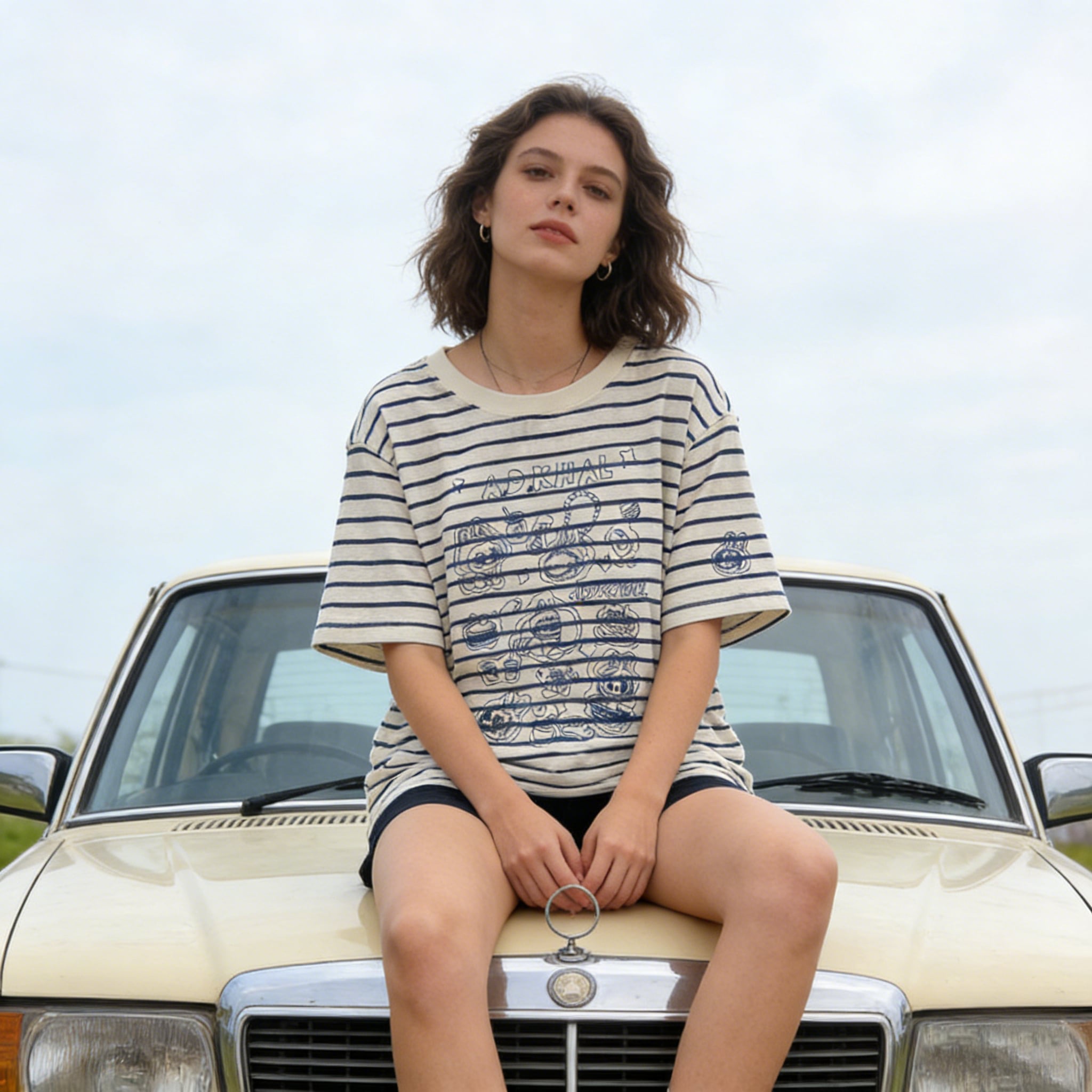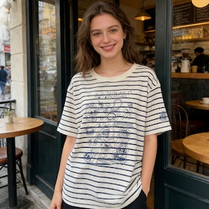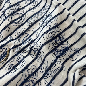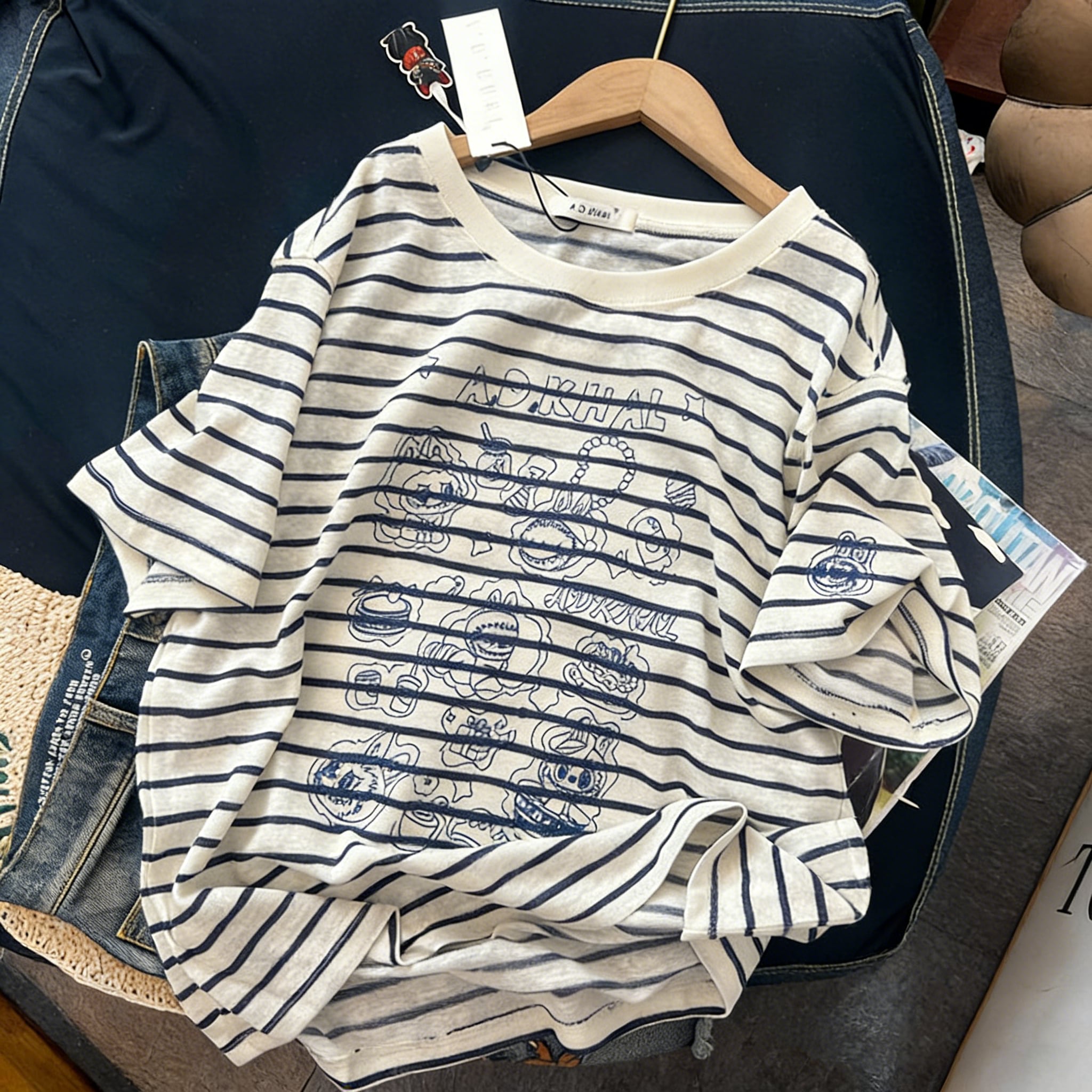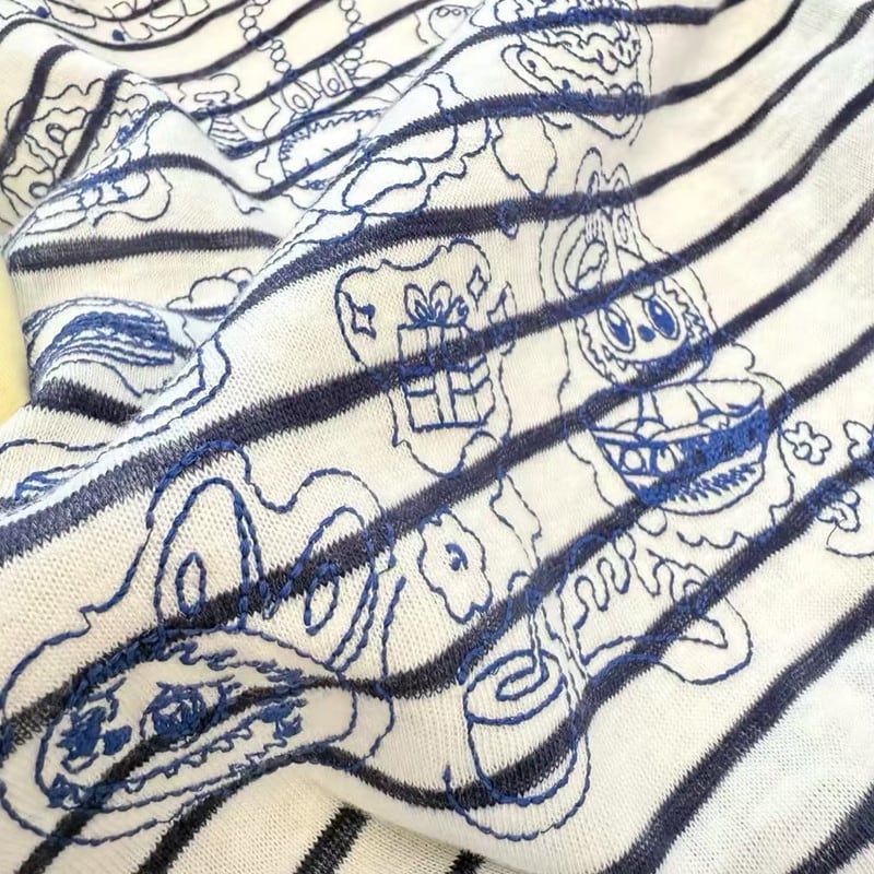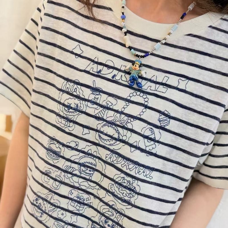 A.D.Khal×LABUBU イラスト風刺繍デザイン 180g ソフトコットン 半袖Tシャツア メリカンストライプ 男女兼用 肌触り最高 プレミアム品質
