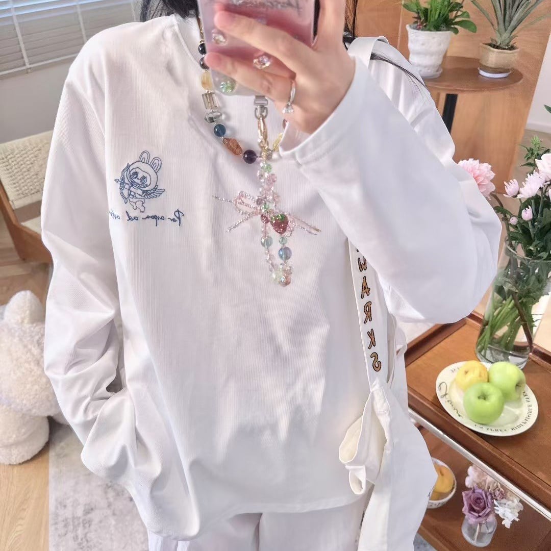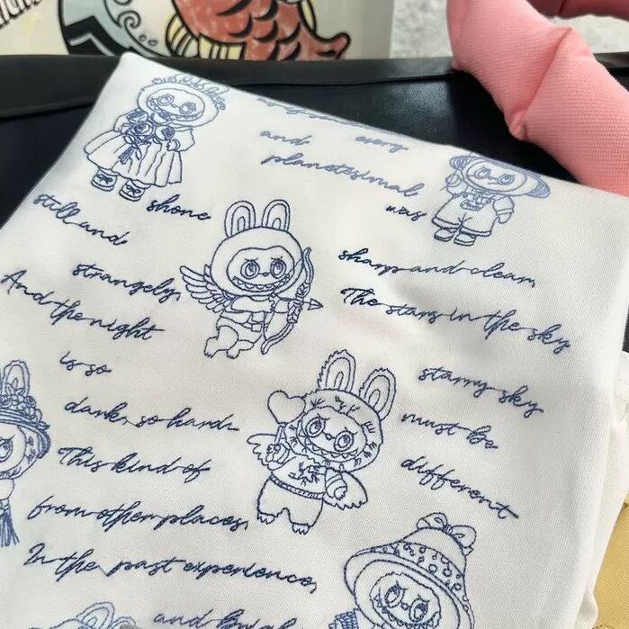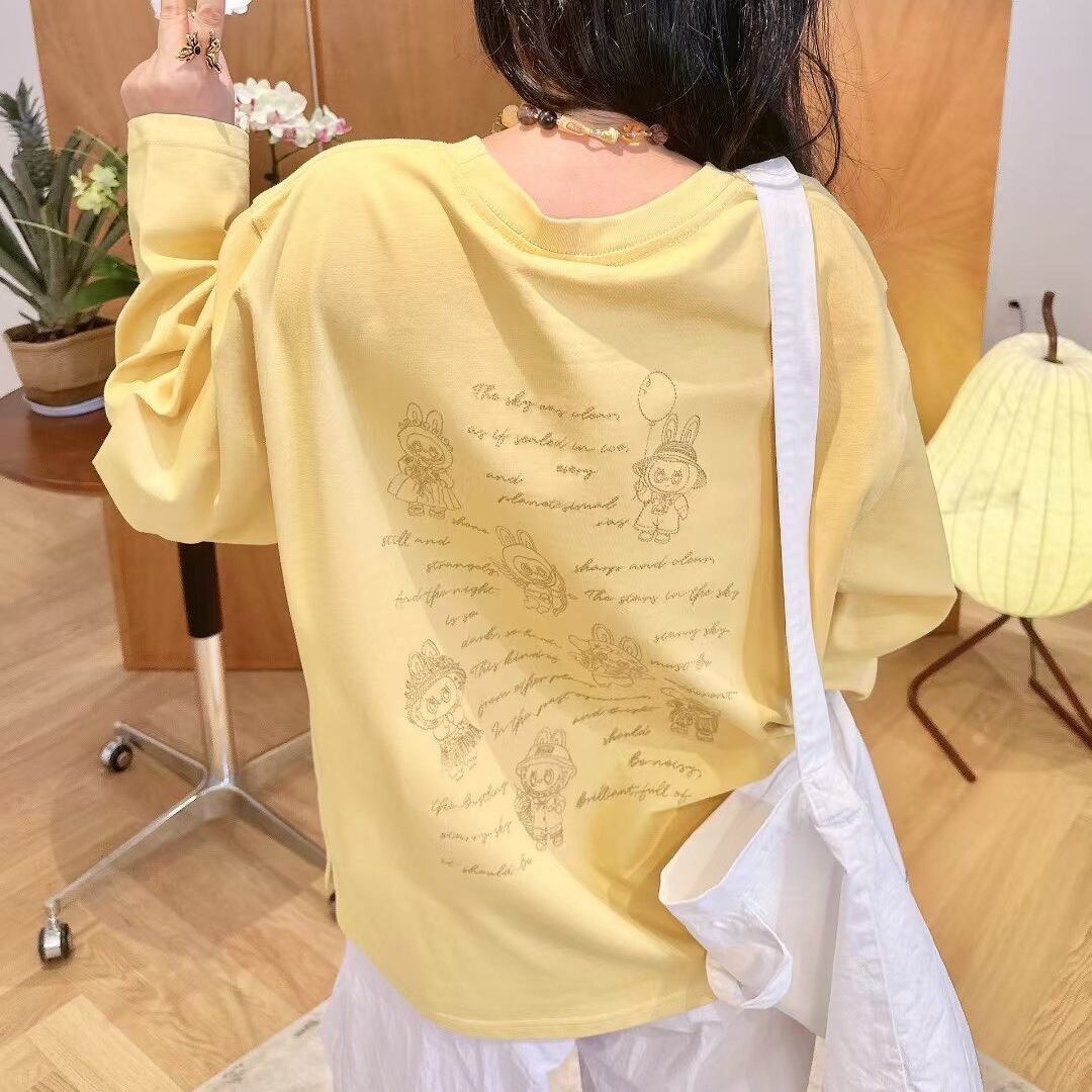 Pandawarks×LABUBU「キューピッドラブブ」長袖Tシャツ シンプル刺繍パーカー|全面レタリング・線画刺繍 高級綿素材 可愛いデザイン ふんわり肌触り