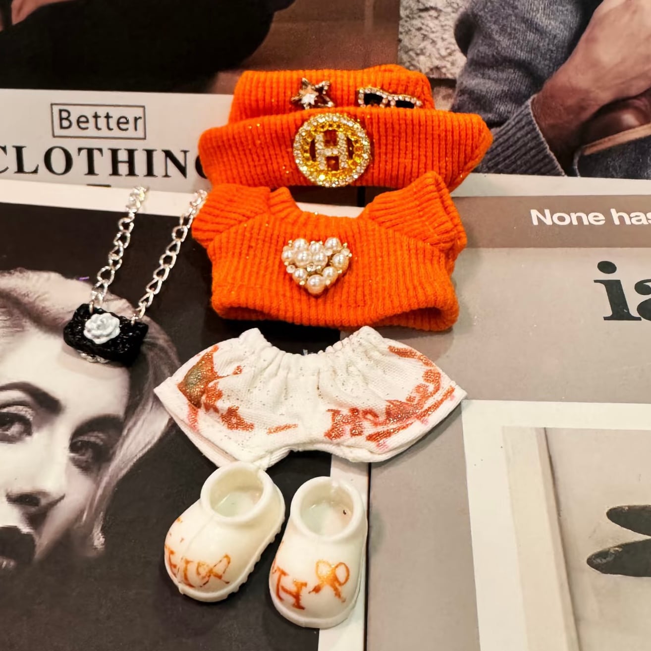 軽奢フルコーデ!個性派ラブブのトレンドコーデ!パール&ダイヤで彩るオレンジホワイト・ニット5点セット labubu 可愛い 軽奢感