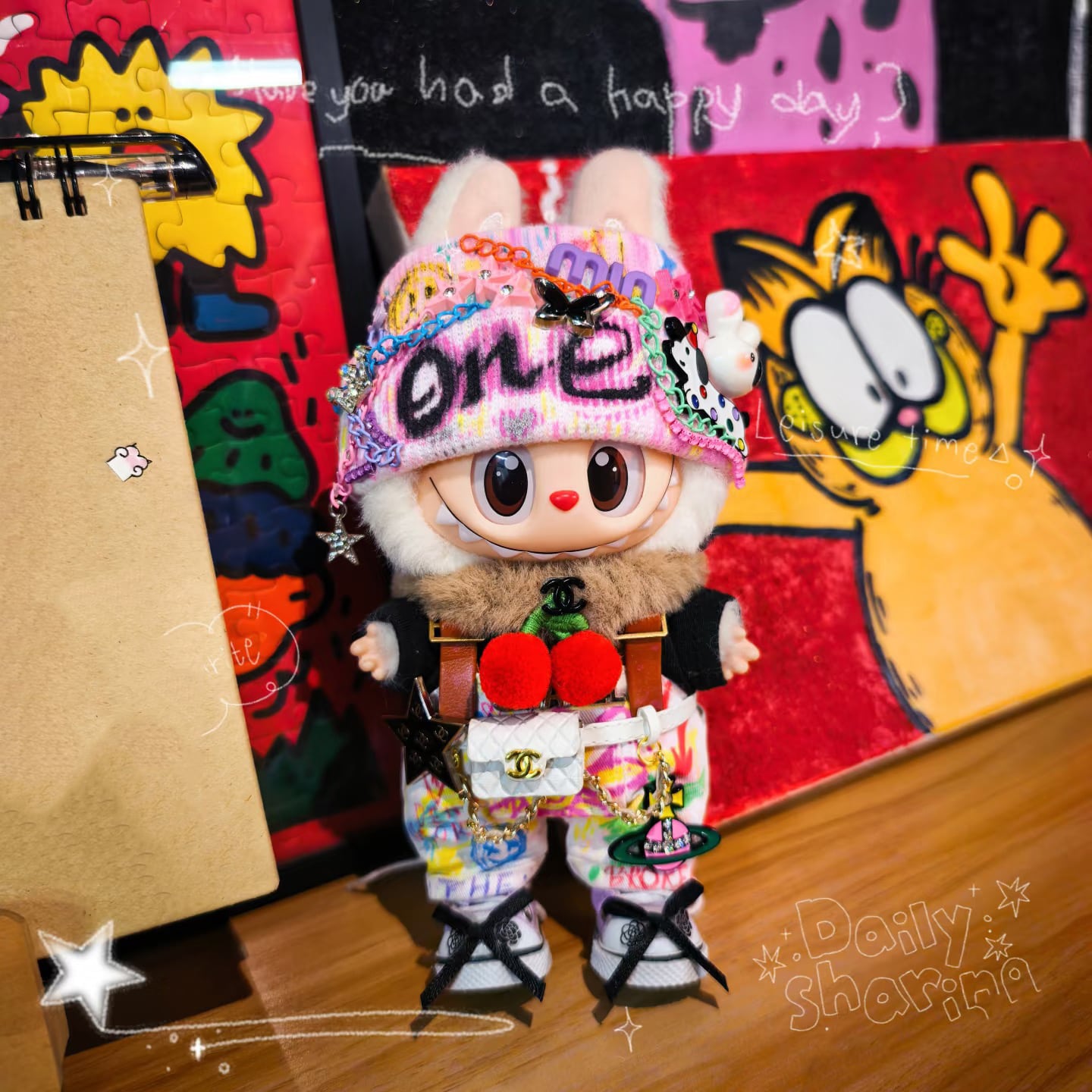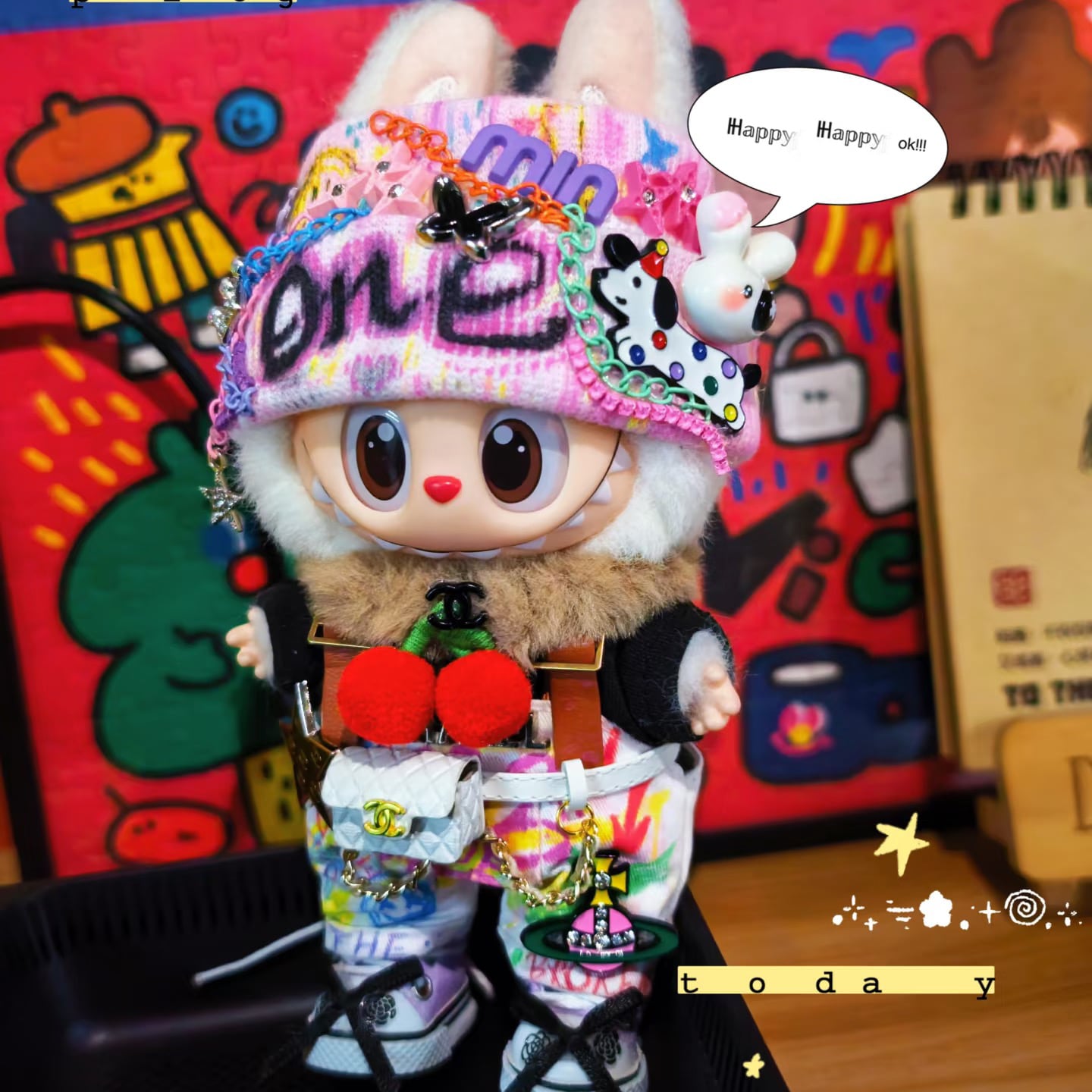 Labubu 用 ストリートクールな着せ替え!Labubu グラフィティ衣装フルセット - こだわり配色とポーチで差がつく、15-17cmラブブを主役にする個性派アイテム