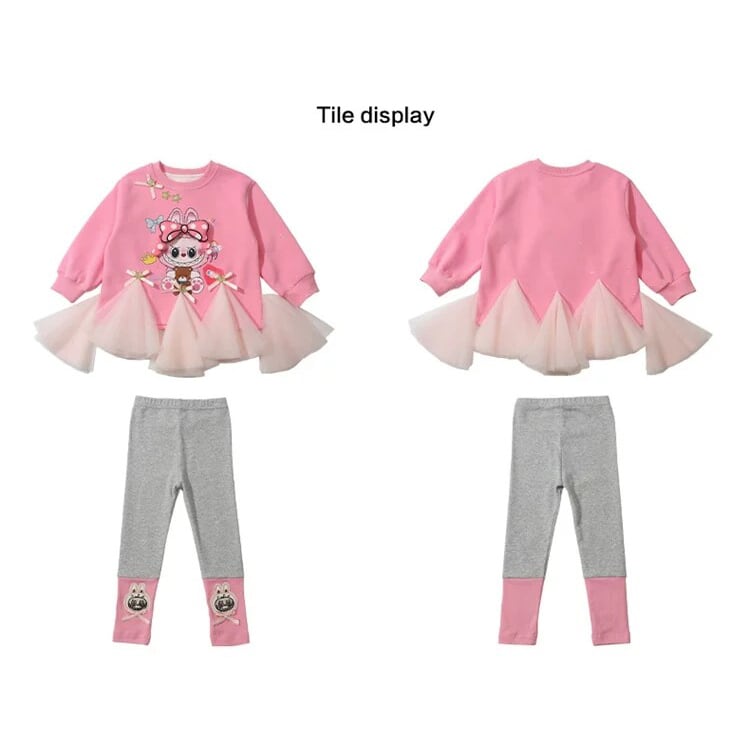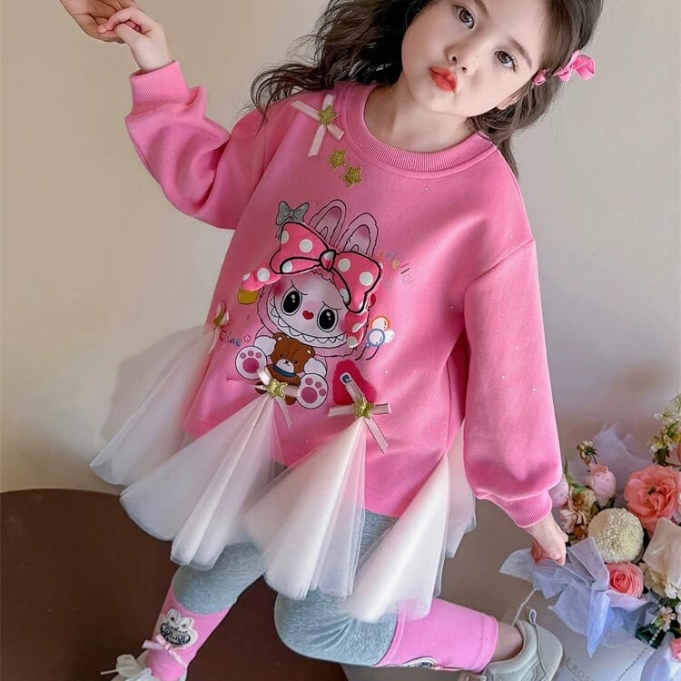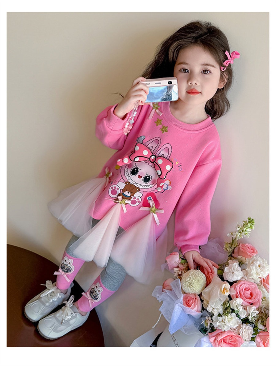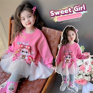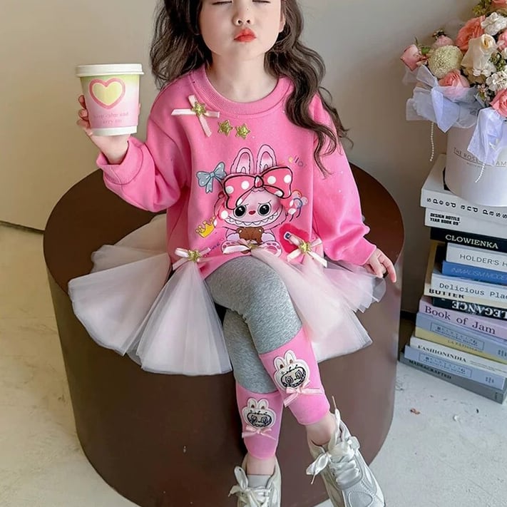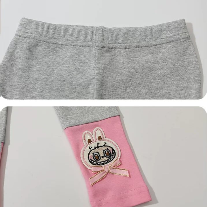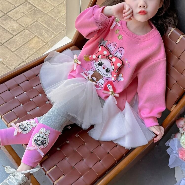 【ワンピース&レギンス セットアップ】甘かわいい labubu ラブブ 子供服 セット - 女の子 パーカーワンピース レギンス 立体リボン 90〜140cm 春 秋 女の子 普段着