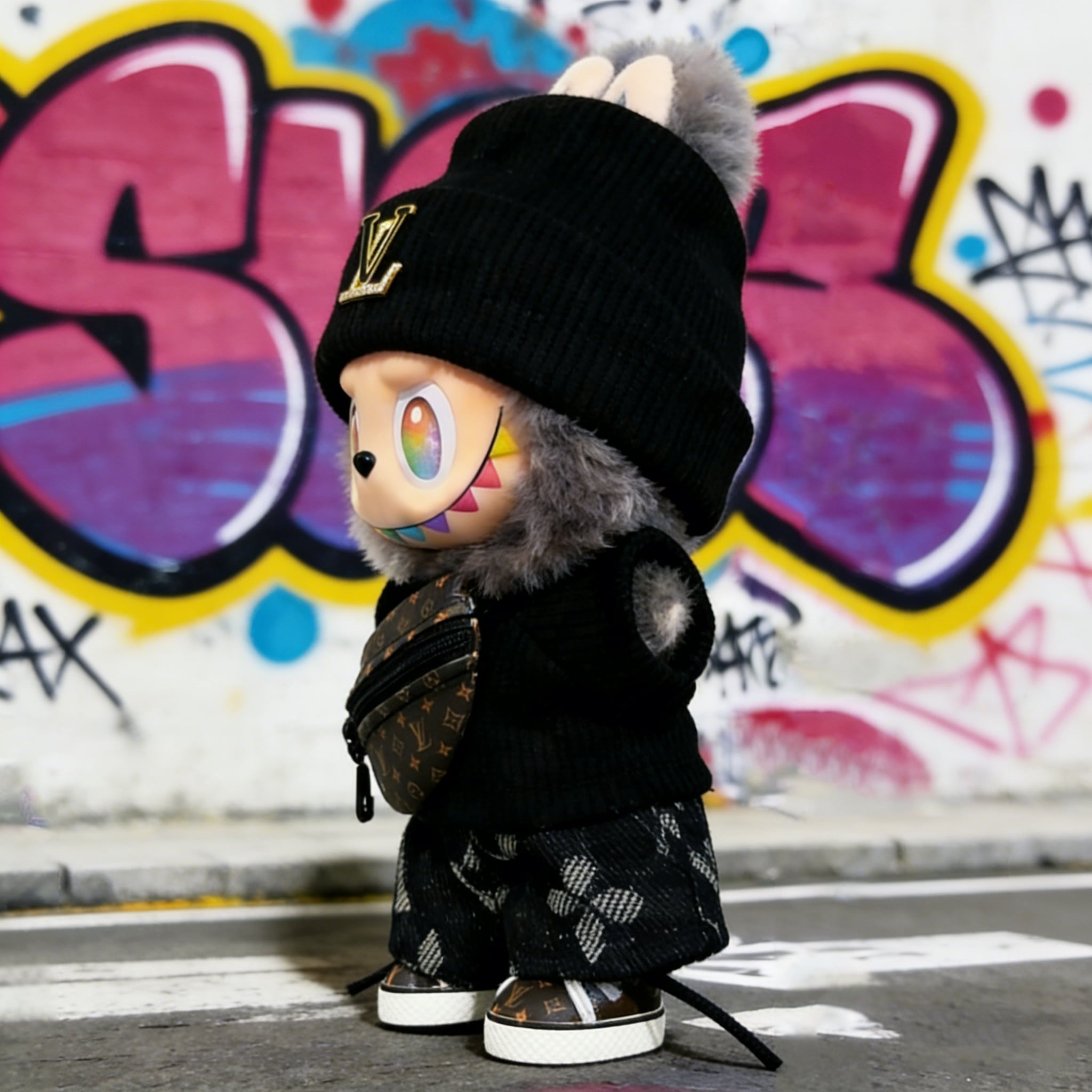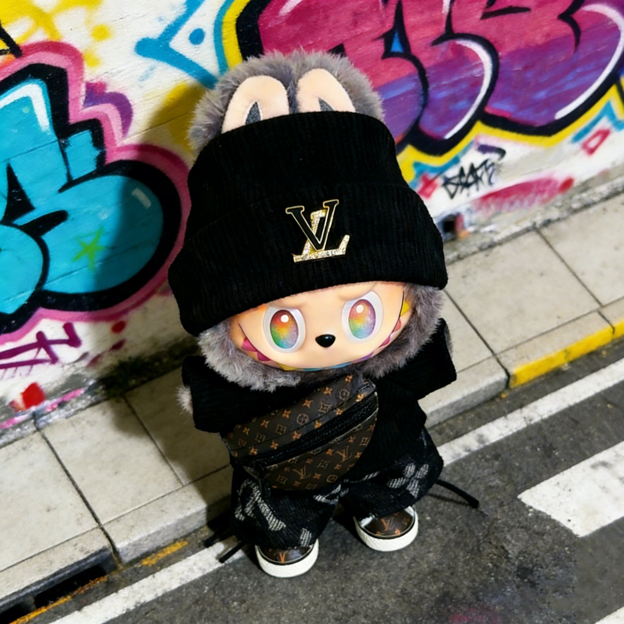 プレミアム黒クールスタイル!17cm labubu 高級感黒クールコーデ ラブブ 上質ニット帽とダイヤロゴが魅力 軽奢華バック付きフルコーデ