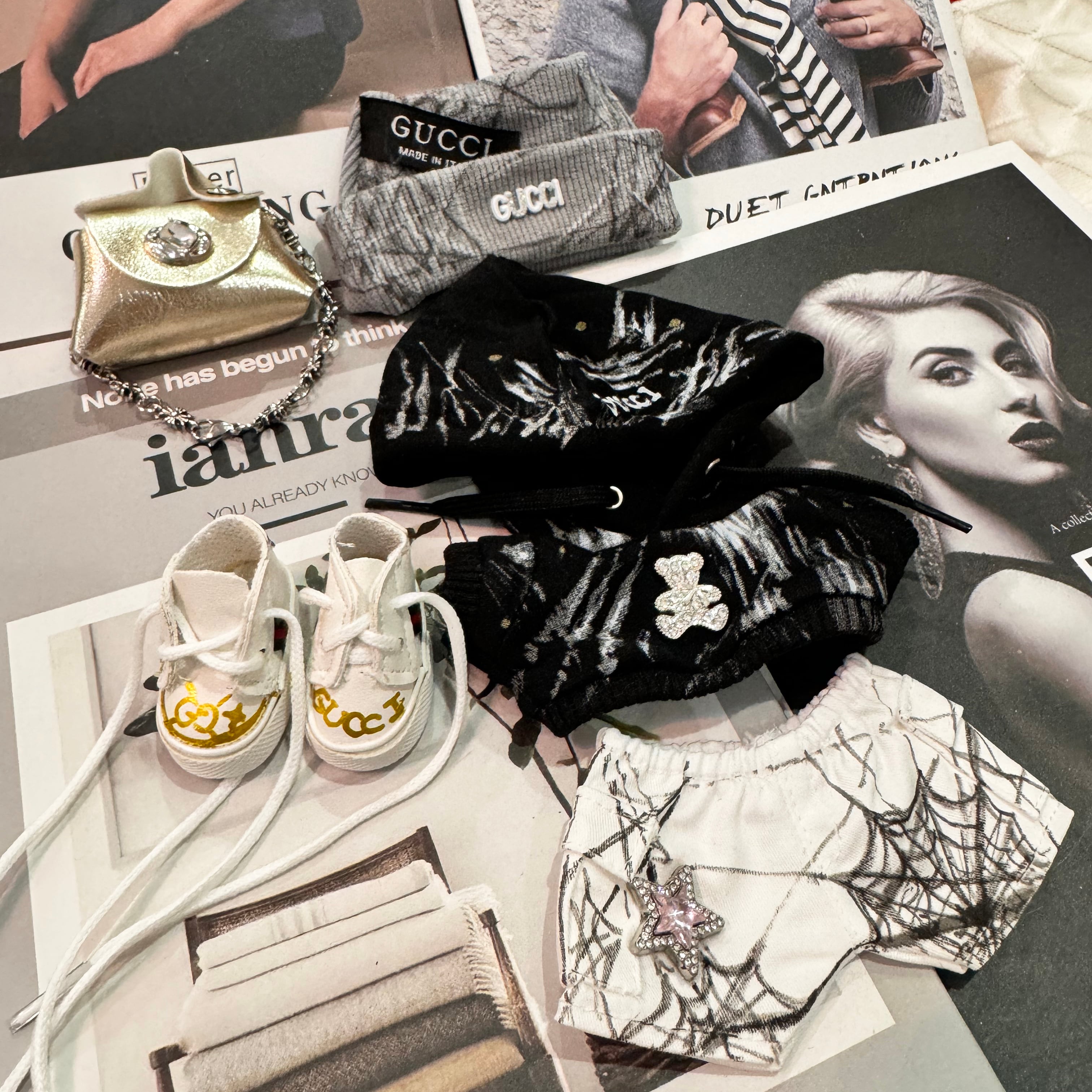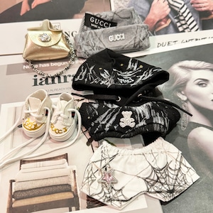 おしゃれ感満載!甘辛ミックス フルコーデ 17cm labubu ラブブ専用 手描きスパイダーウェブ柄スウェットセット ゴールドバッグ付き 個性派 クール