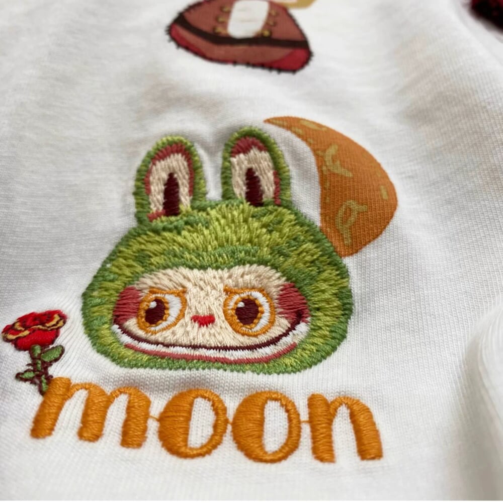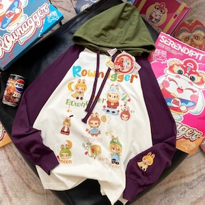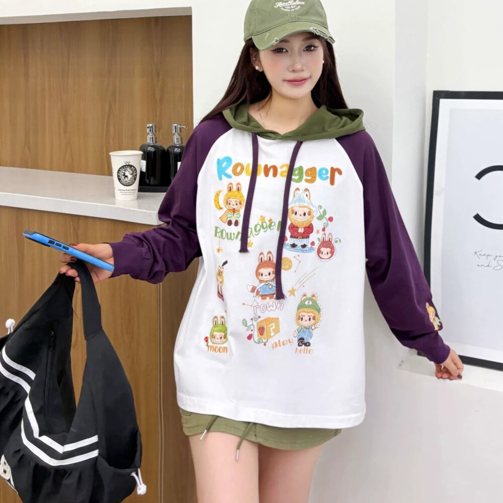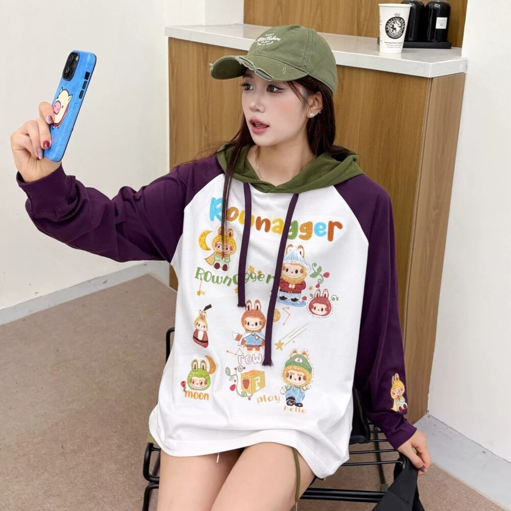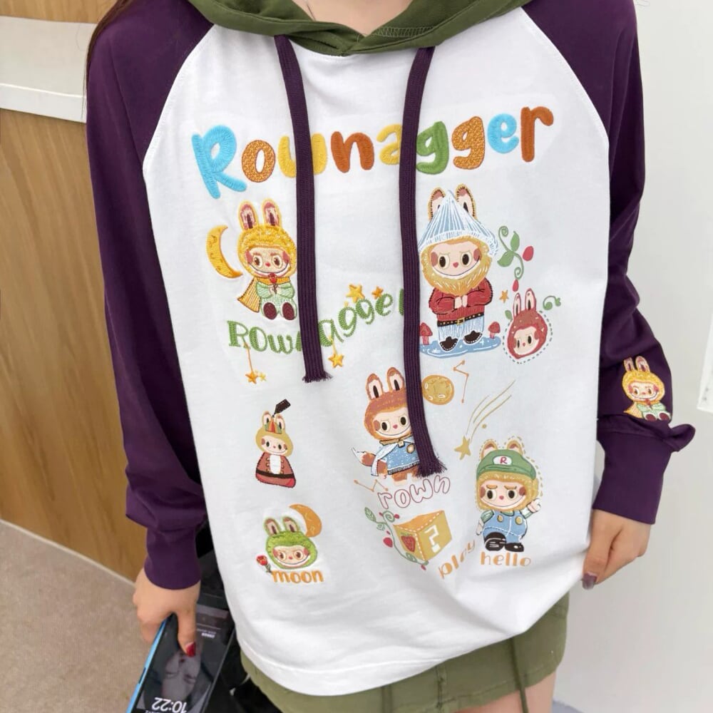 260g厚手 綿100% 長袖 オーバーサイズ 韓国風 Labubu フーディー パーカー 刺繍入り バイカラー 可愛い ストリートウェア