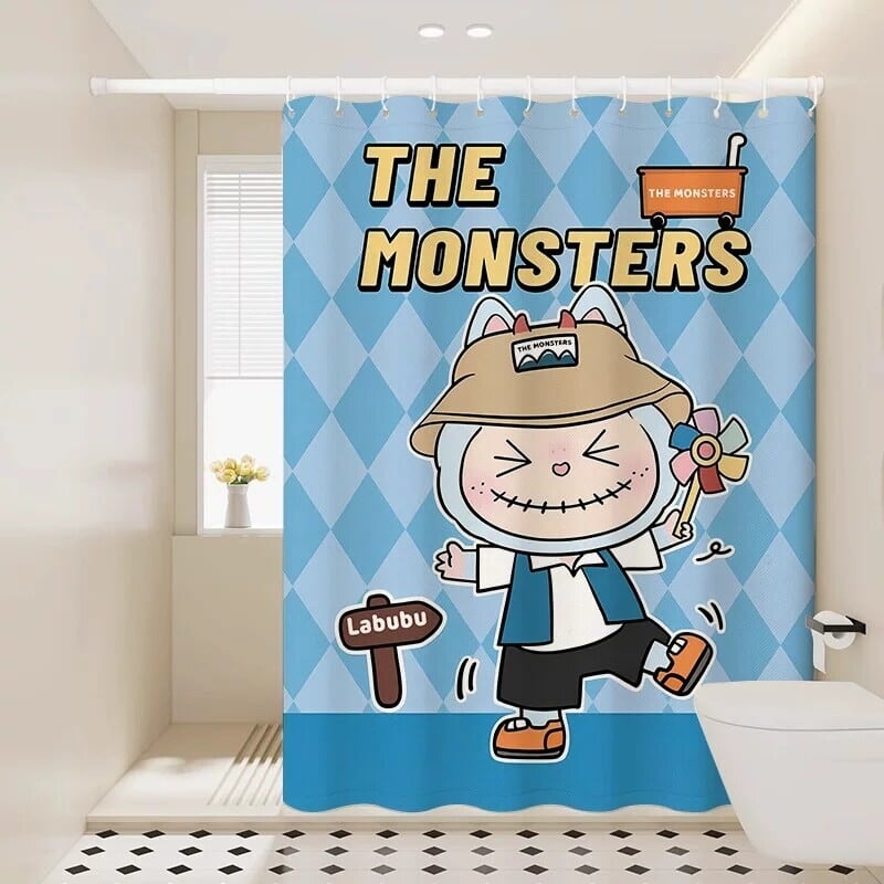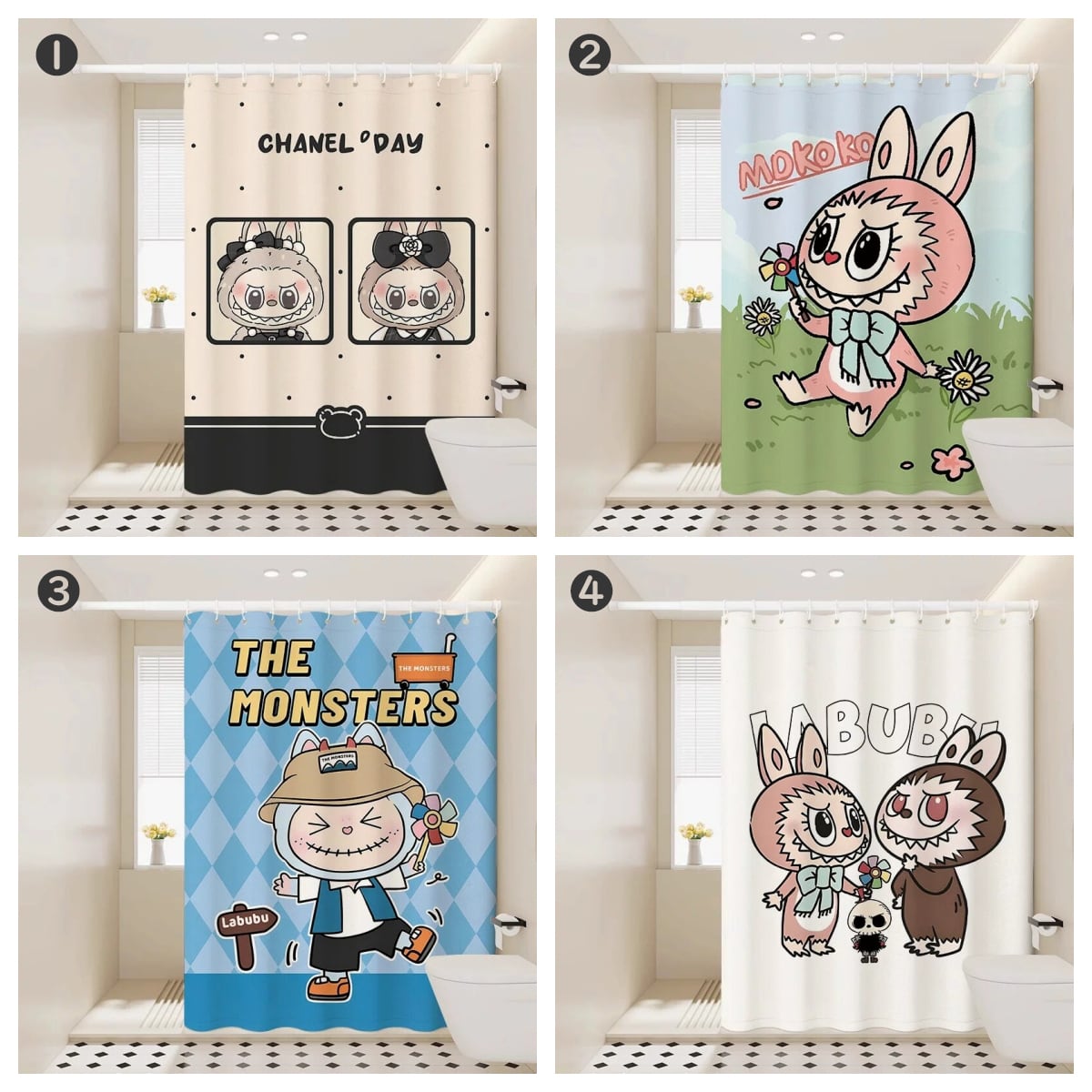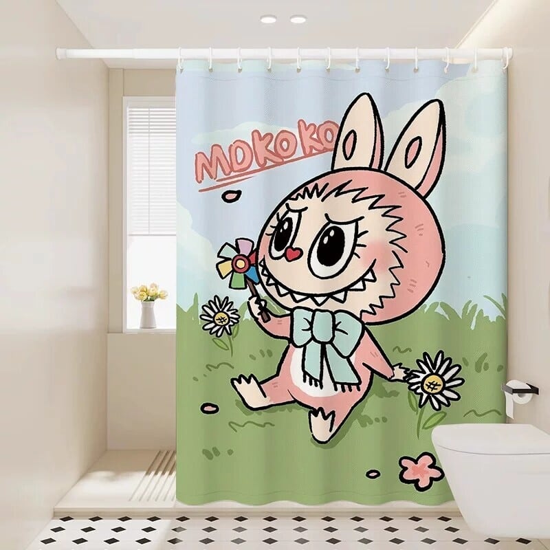 お風呂がもっと楽しくなる!ラブブの防水カーテン かわいいイラスト 洗面所やバスルームの目隠しに 穴あけ不要 リングと結束バンド付き