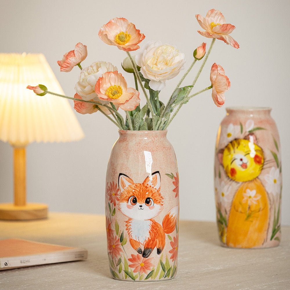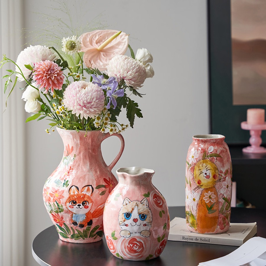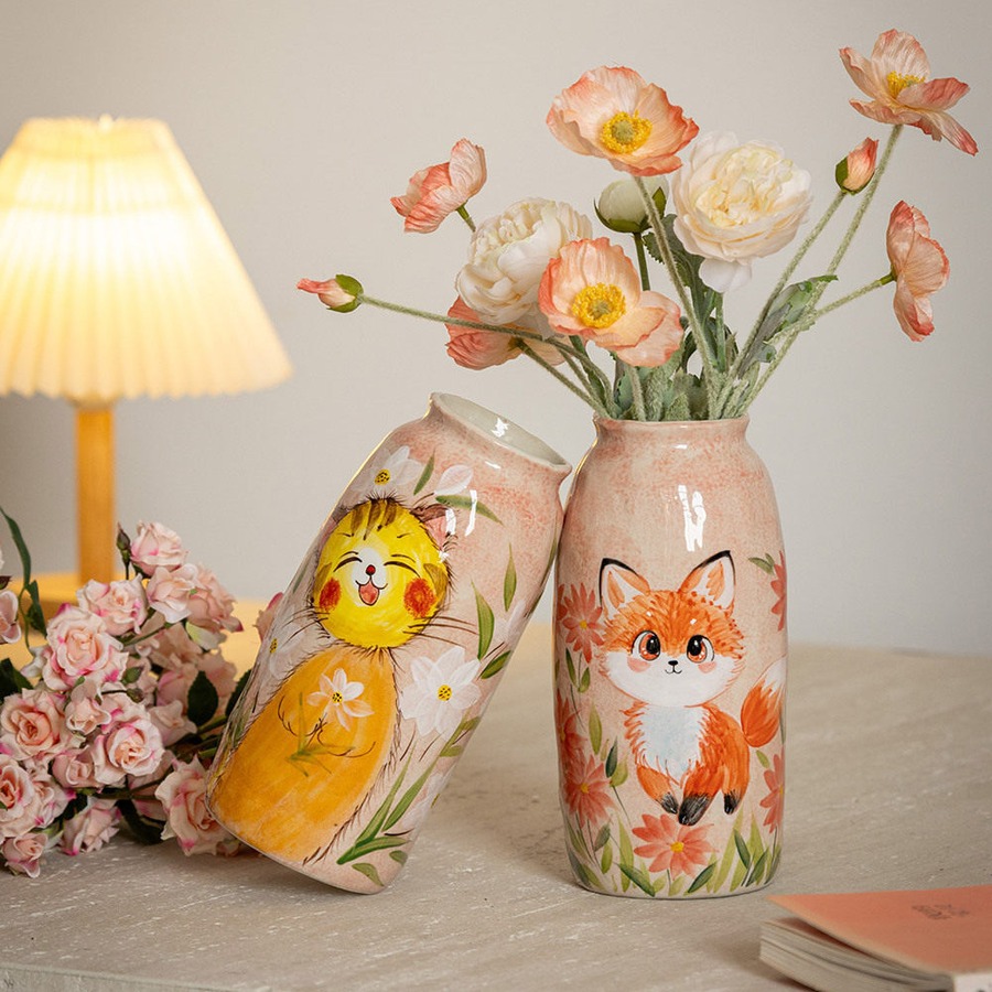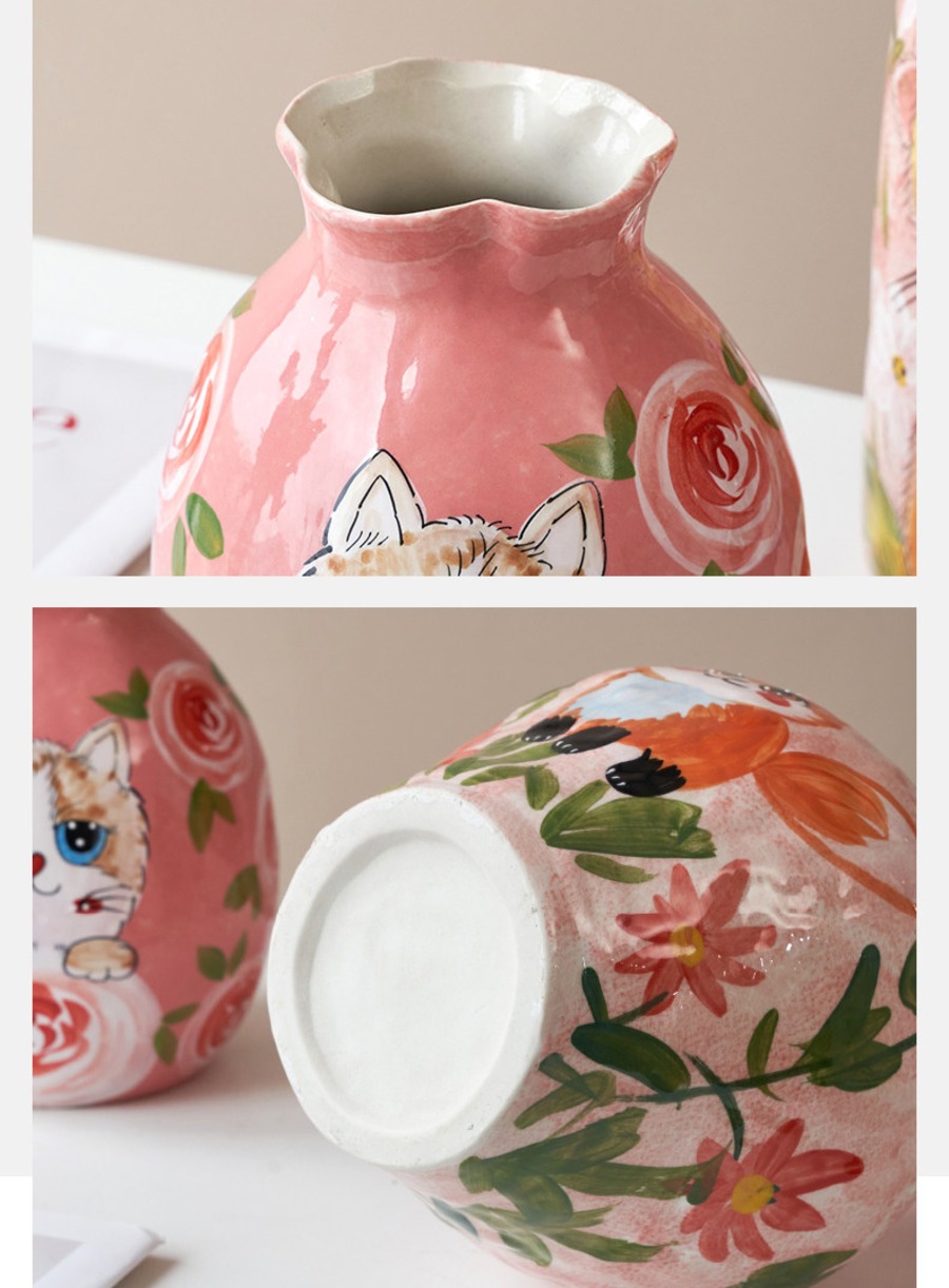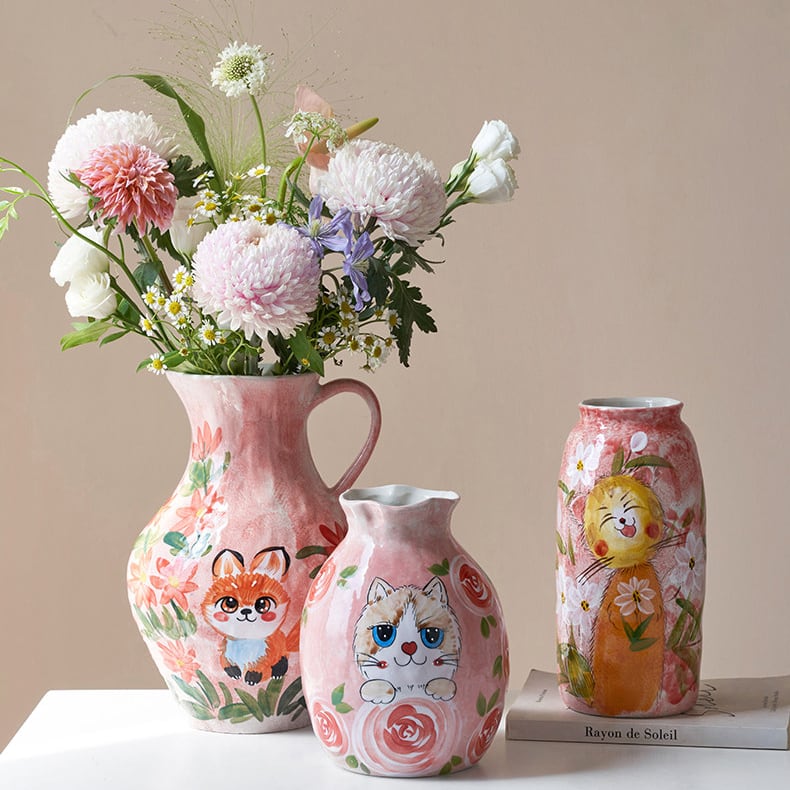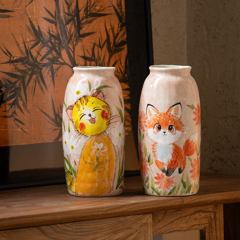 中国・景德鎮の職人技が光る、手描きの動物モチーフ陶器花瓶。ふんわりと優しいタッチで描かれた犬や猫、うさぎなどの萌えペットデザインが、見るたびに心を和ませてくれます。全3種類の可愛いフォルムから、お好みのスタイルをお選びいただけます。