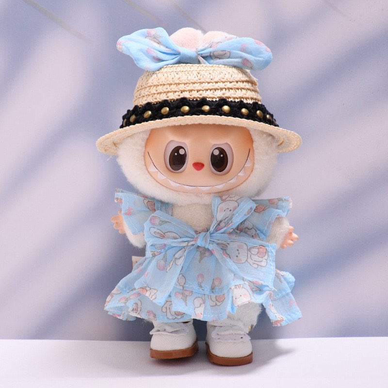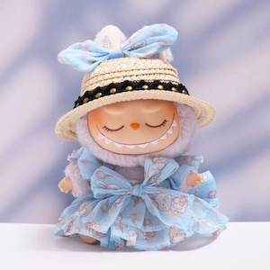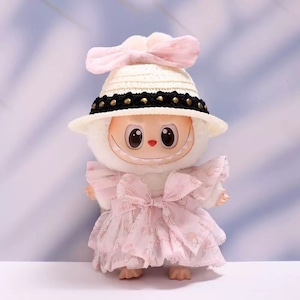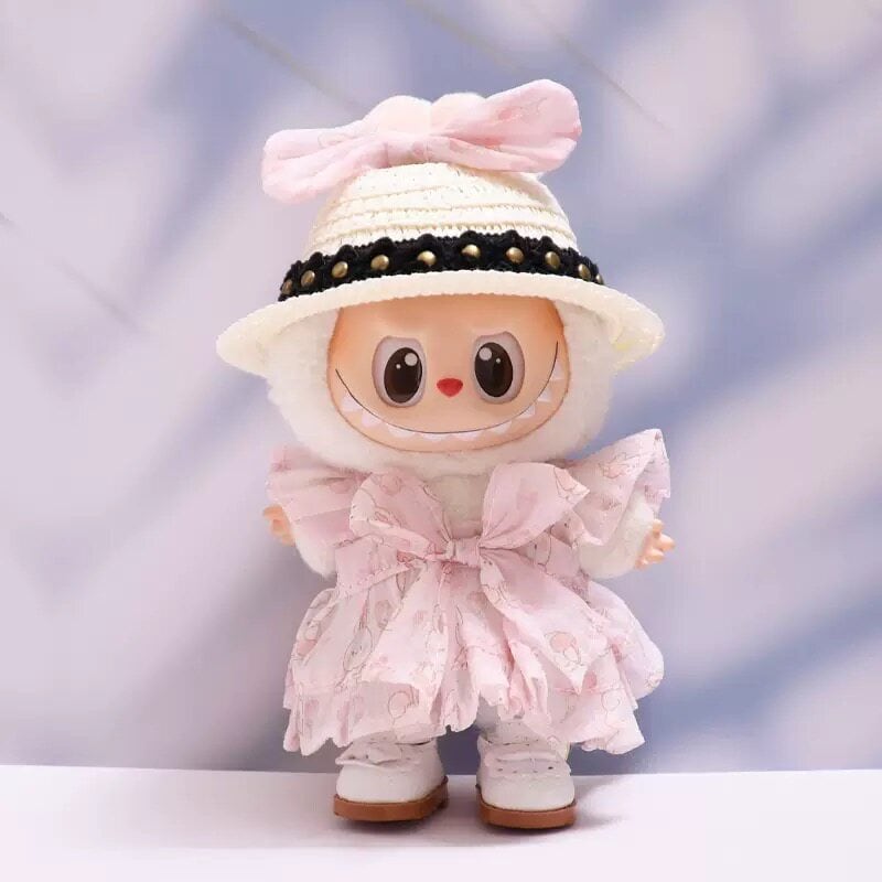 Labubu ラブブ17cm用 春のお姫様ワンピースセット ふんわりチュール×ピンクうさぎリボン 麦わら帽子&白シューズ込み 17cm用 軽やか