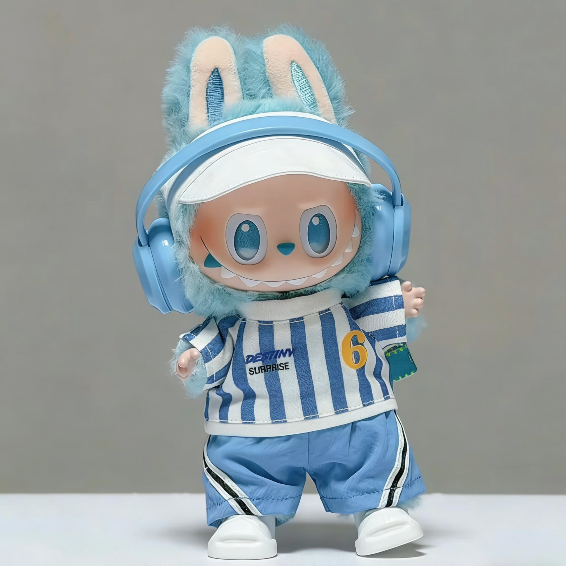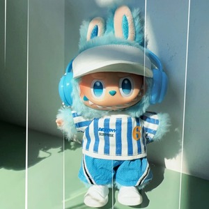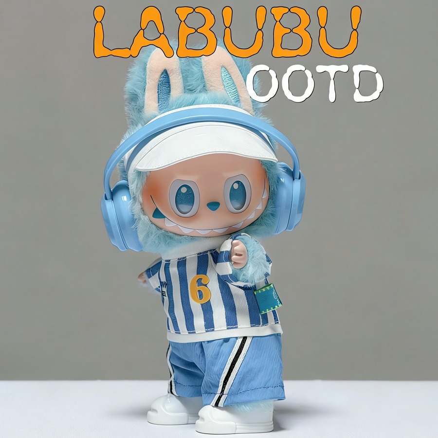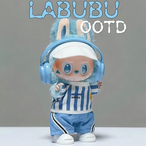 【商品名】Labubu ブルー×ホワイトストライプのユニフォーム風コーデ